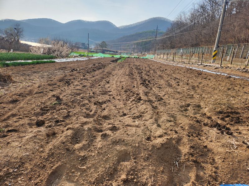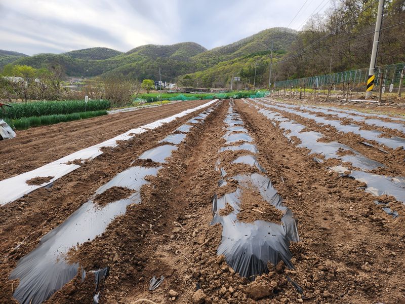 경주시서면도리에밭경운기이용로터리쳐서골짓고비맞힌후수식으로비닐멀칭완료모습임4월말고추심을계획임니다
