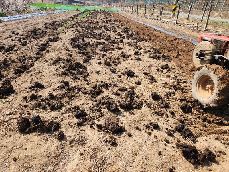 노지고추400포기심을자리퇴비및밑비료살포후경운기로터리작업후비닐멀칭(괭이사용)삼줄작업