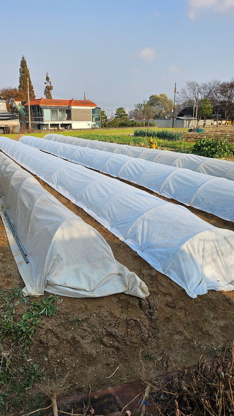마늘 양파 4줄중 2줄 부직포 덮고 고정핀으로 고정