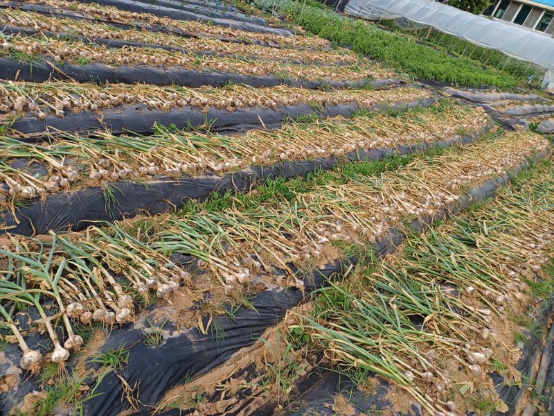 건조된마늘 줄기자르고 비닐하우스안에서 건조 시작함