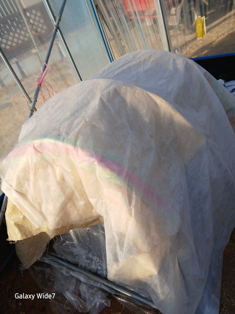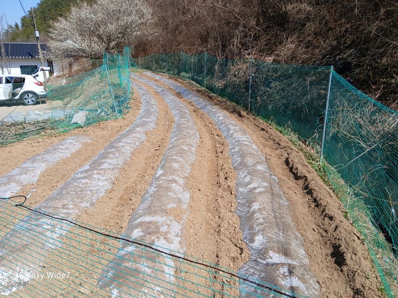 이웃집 아주머니들 마늘 밭에 구직포를 씌우기래 나도 따라 씌웠다
