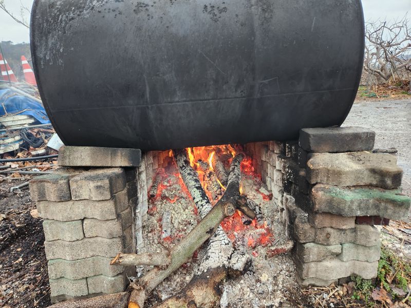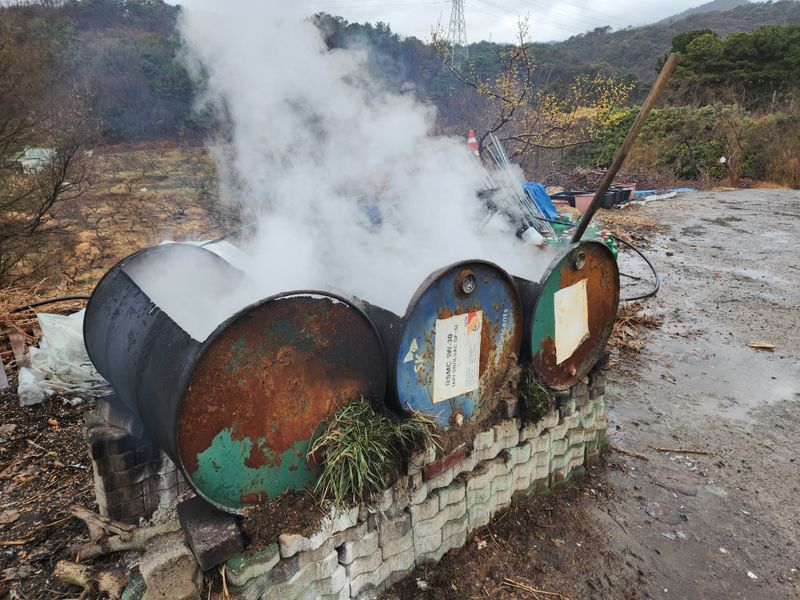 감나무에 병해충 특히 깍지벌레를 방재하기위해 유황 20키로와 생석회 10키로를 혼합하여 8시간 이상 쎈불로 끊여 만드는데 장난이 아니더군요 산과는 거리가 많이 있지만 산불예방차원에서 비오는 날 끊였더니 지인들이 조금씩 얻기위해 왔더군요