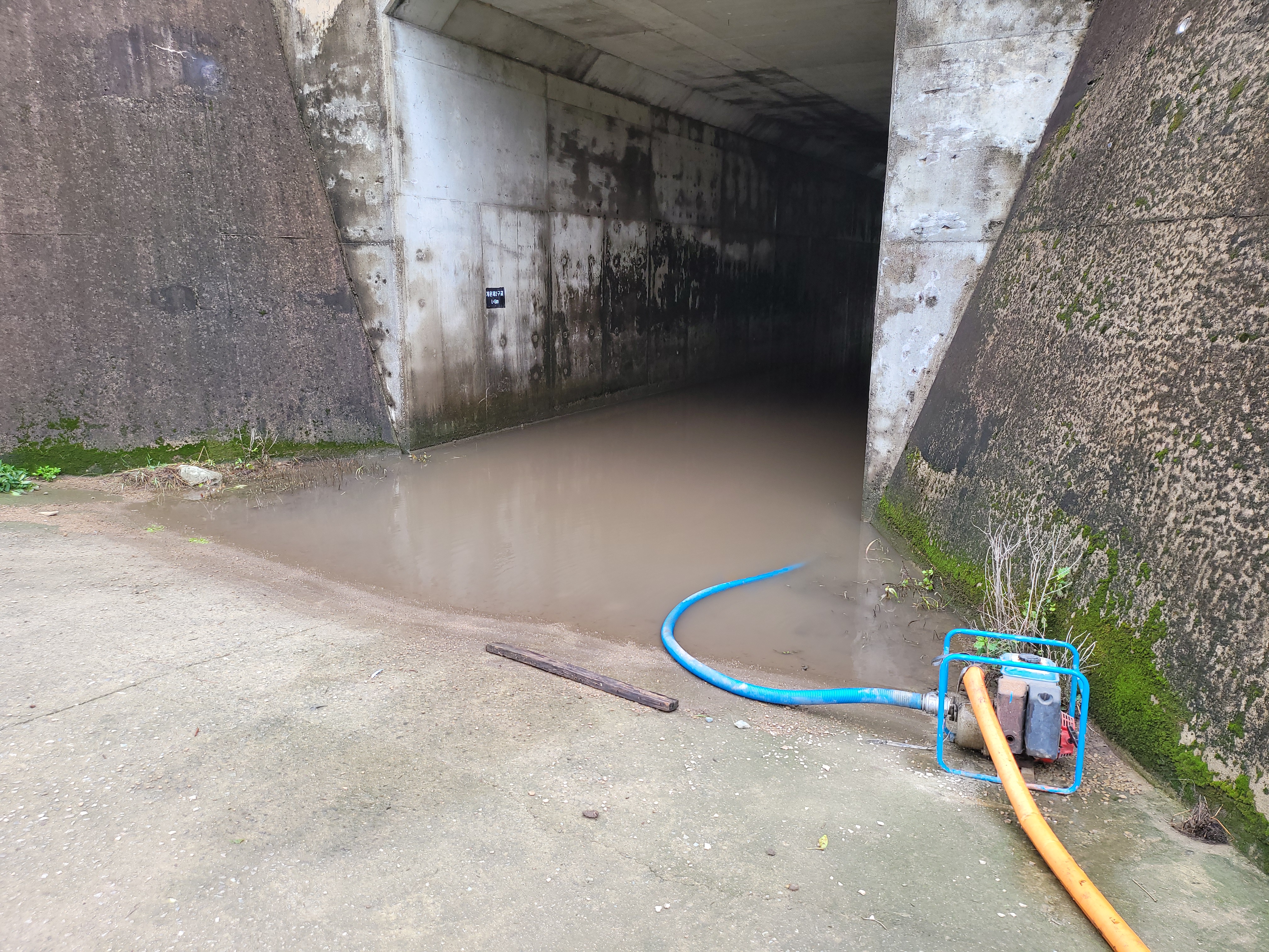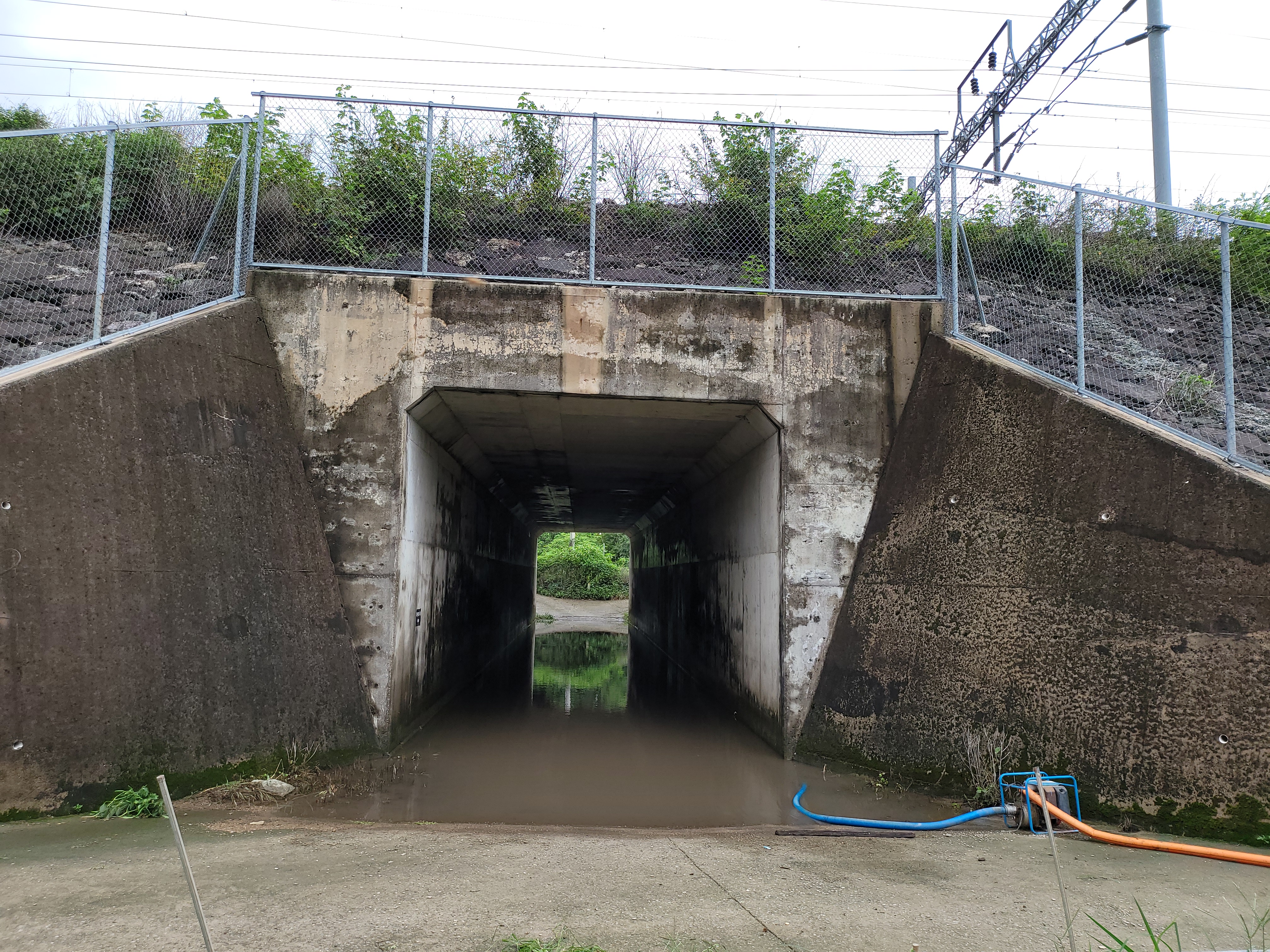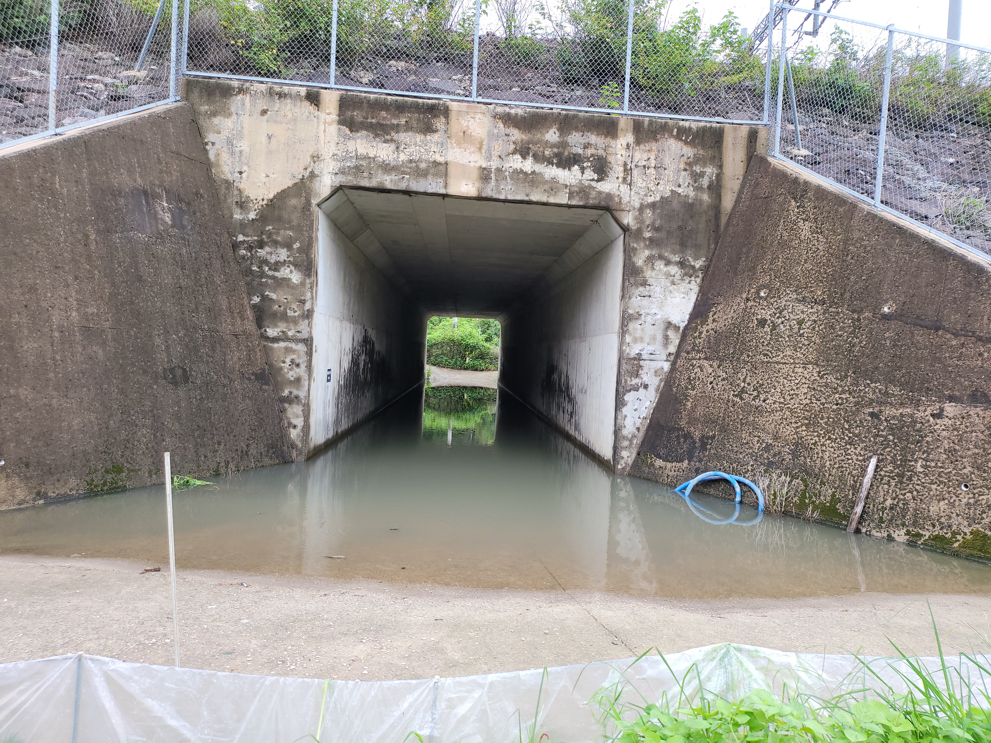 고추밭 입구 새벽 큰비로 철도 지하통로 밑 물이차서 들어가지 못함 구만 리 424번지 유인줄 보완작업