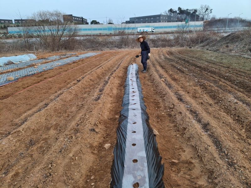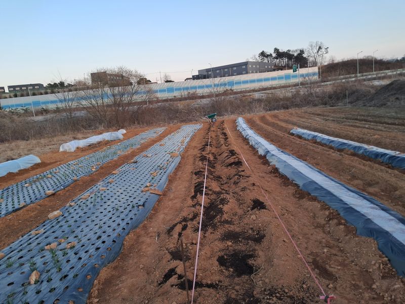 . 마늘 파종. . 배추 추비. . 양파 파종 예정지 제초매트 덮기. . 토마토 뽑아냄.