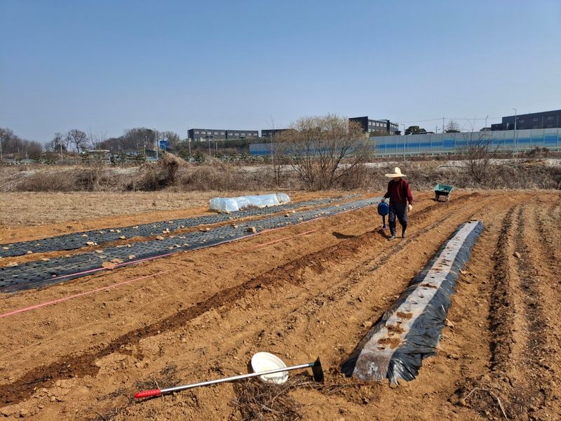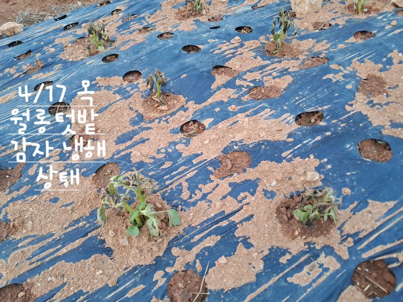 지난 꽃샘추위로 몇가지 피해 입음. 쑥갓묘,고구마 가식한 잎 이 냉해로 녹라버림. 대파도 고개를 떨굼. 로메인상추 비닐 터널이 날라가버림.튤립 안전. 이런한 현상은 주말 한번 가다 보니 철저하지않고 쉬운 방법 추구함에 기인함을 후회합니다 여러가지 제약도건이 있는지...