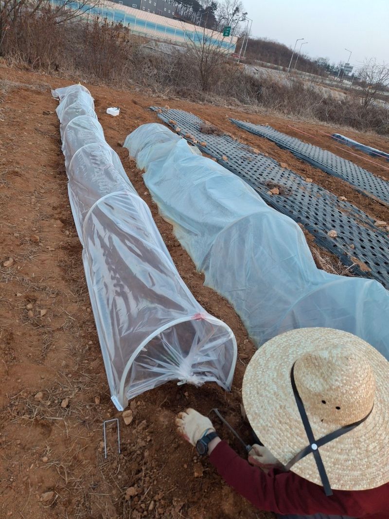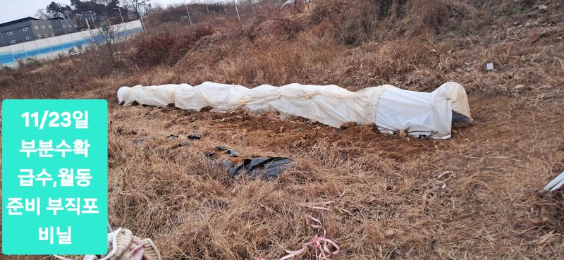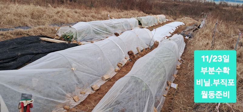 월동작물 보온 조치 .남은 알타리.남은 쪽파.치커리 .현재 먹고있는 상추 .살아 남은 배추들 .남은 돌산갓 .무우(재파종2회 탓에 좀 복잡) *양파:발아율100%된듯 *마늘:발아율 70%? *월동 시금치 ===>부직포,부직포/비닐 서투른 농부라 올해 넘 폭망하여 내년...