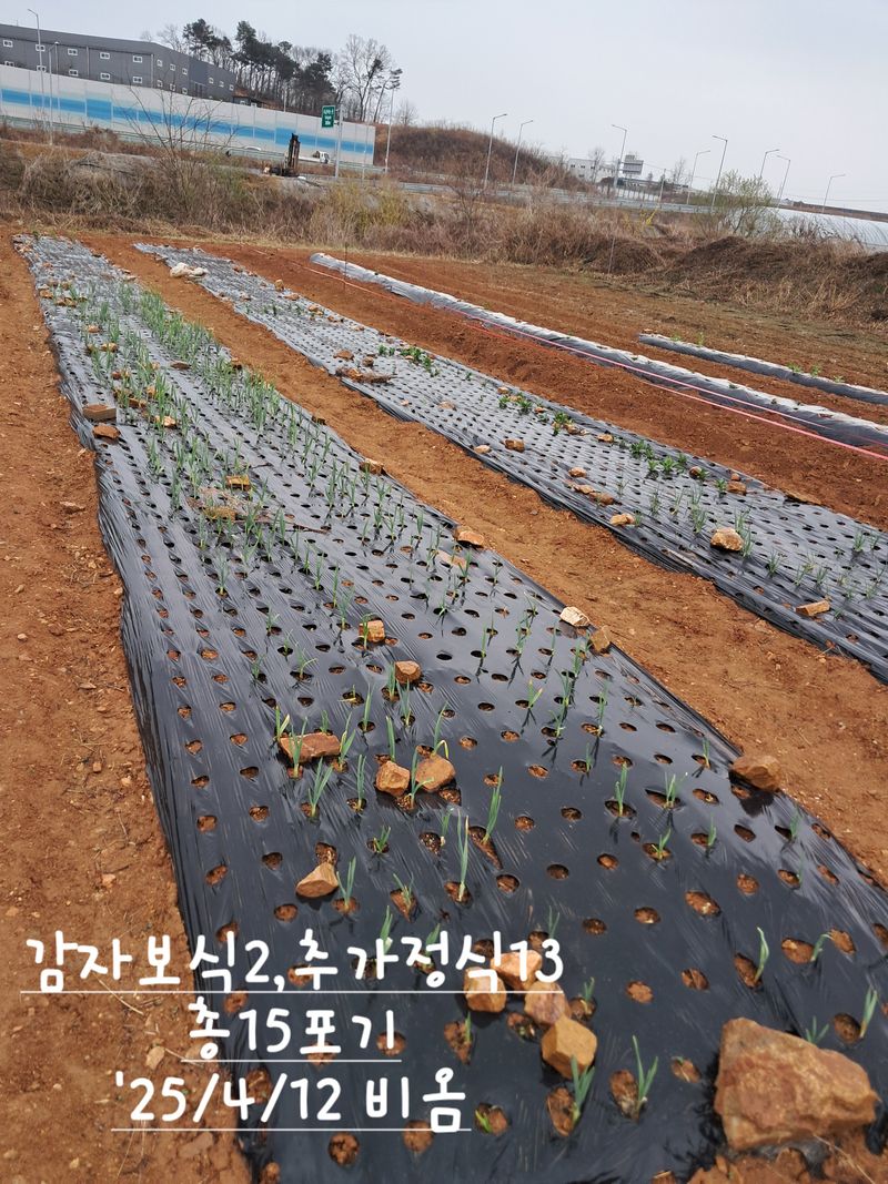 가뭄과 꽃샘추위로 냉해입은 작물들이 이번 비로 살아나기 를 바라는 마음이다.쑥갓은 포기,대파?, 가식한 고구마 포기 부추,감자,완두콩,로메인 상추 가능성 80%.