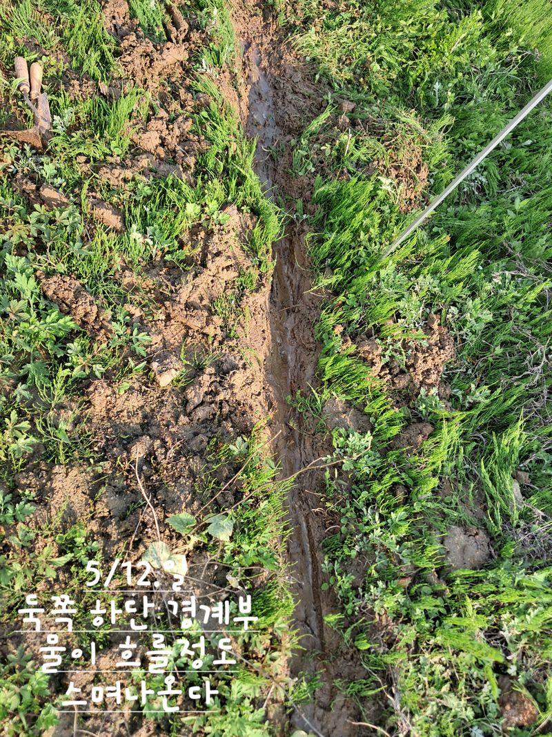 당근/비트와 생강을 심었는데 둑 윗쪽 넓은 밭에 내린 빗물이 밑으로 스며들어 그 영역에 들 어 물에 잠가다시피한 상황 입니다. 고의도 아니고 함께 작목해야하니 좋은 방안이 없을까요? 여기에 고구마 파종코져 합 니다. 고수님들 고견을 좀 듣고 싶습 니다.