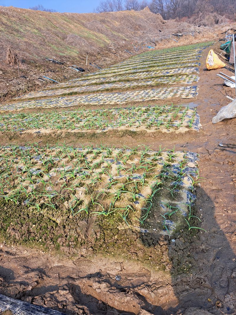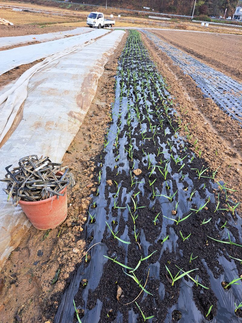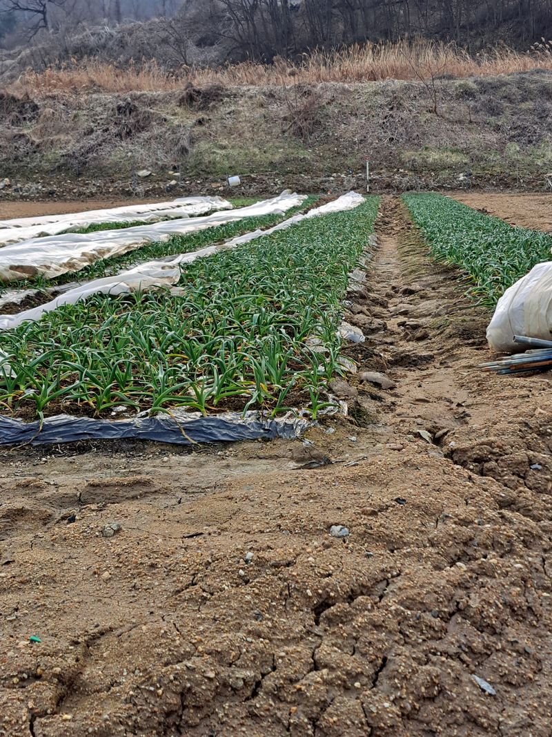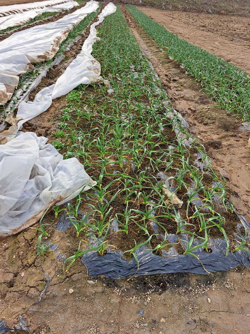 홍산마늘 부지포겉기와 웃걸음살포 OK 20KG 덥었던 부지포을 벗기니 마늘싹이 꽤나 크게자랐어요 비가온다고하여 서둘러 작업을 마쳤다