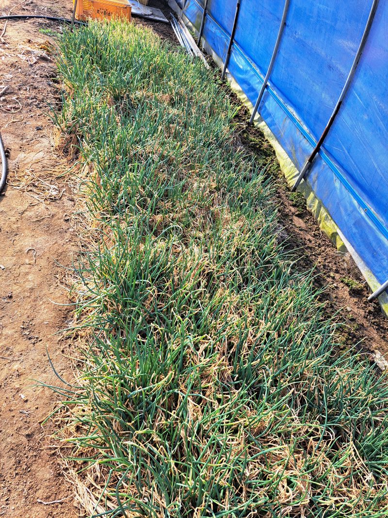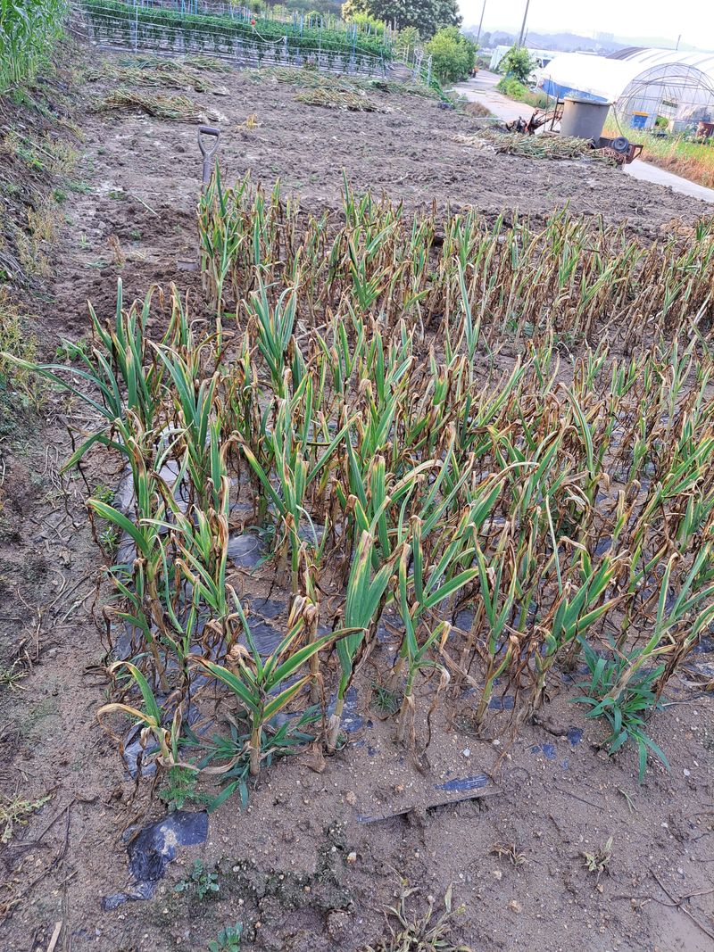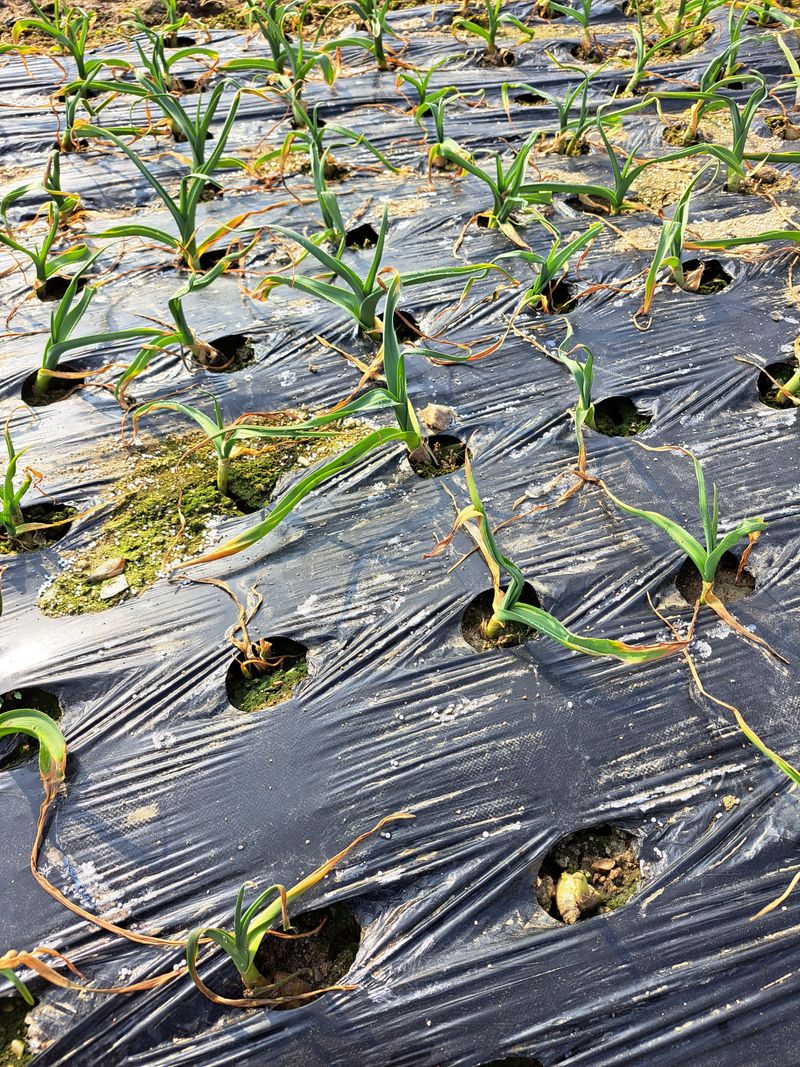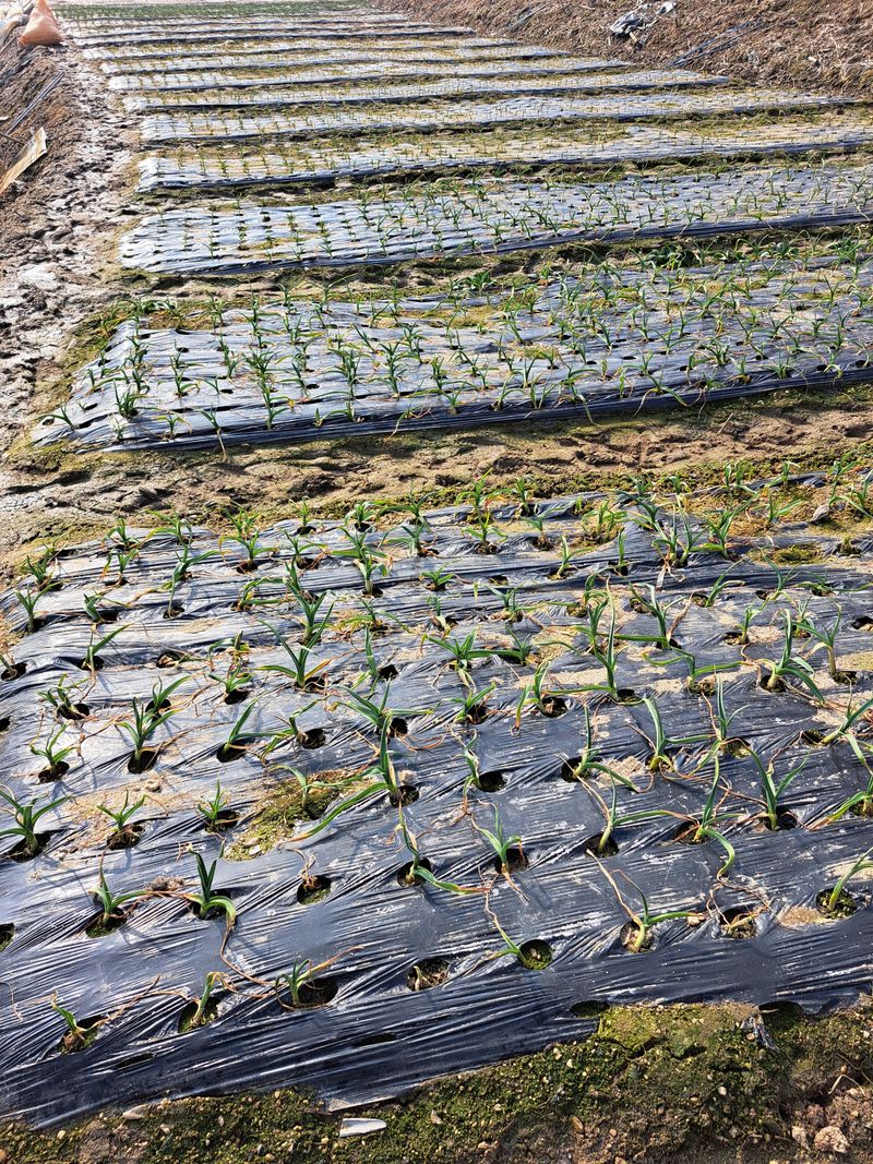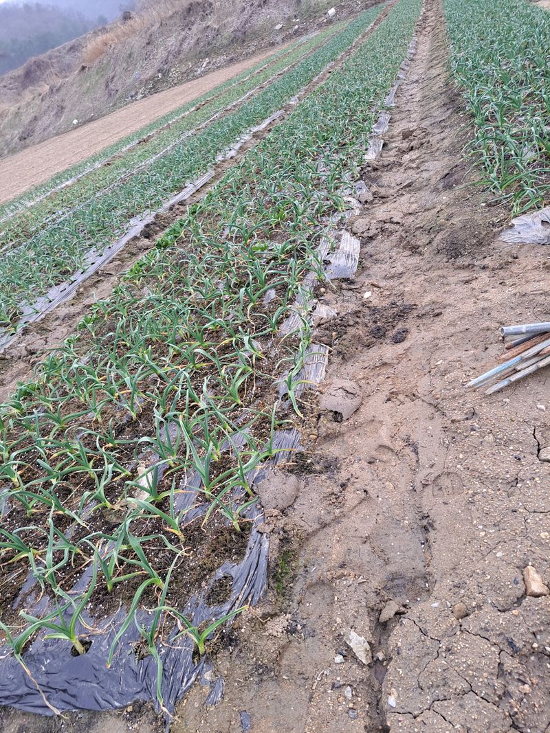 홍산마늘 부지포겉기와 웃걸음살포 OK 20KG 덥었던 부지포을 벗기니 마늘싹이 꽤나 크게자랐어요 비가온다고하여 서둘러 작업을 마쳤다