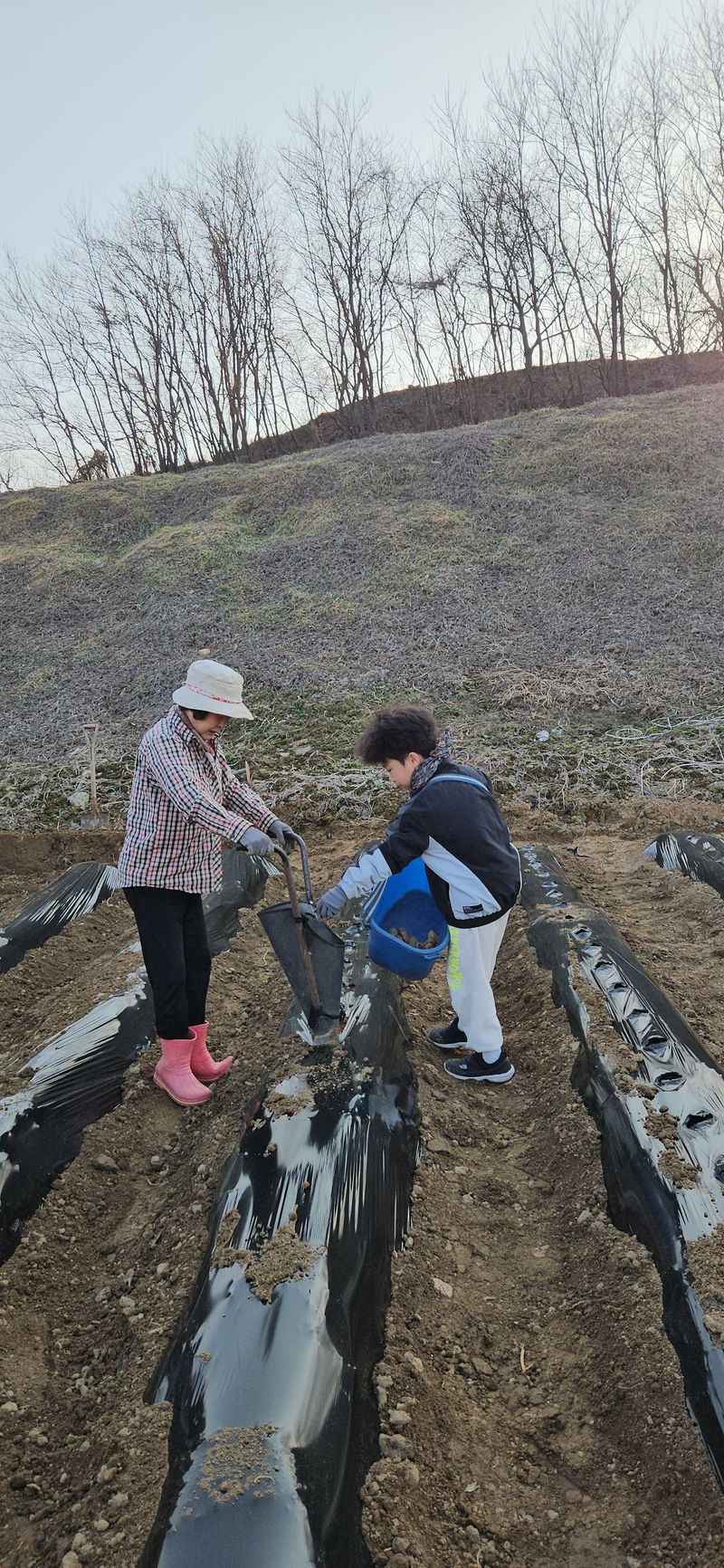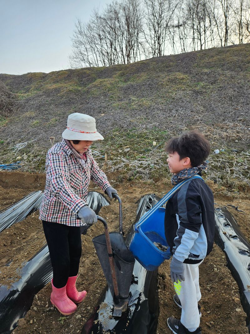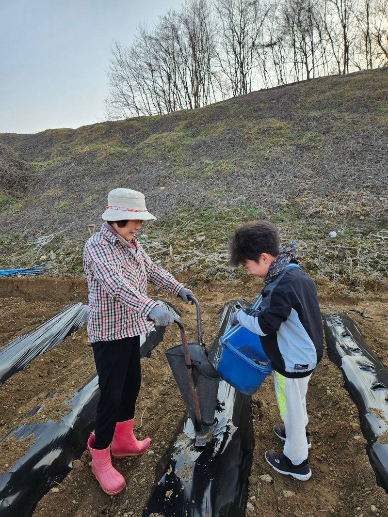 감자 🥔 심었어요 할머니와 손자하고 감자을 다정하게 감자심기를 하고있어요 보기좋아요