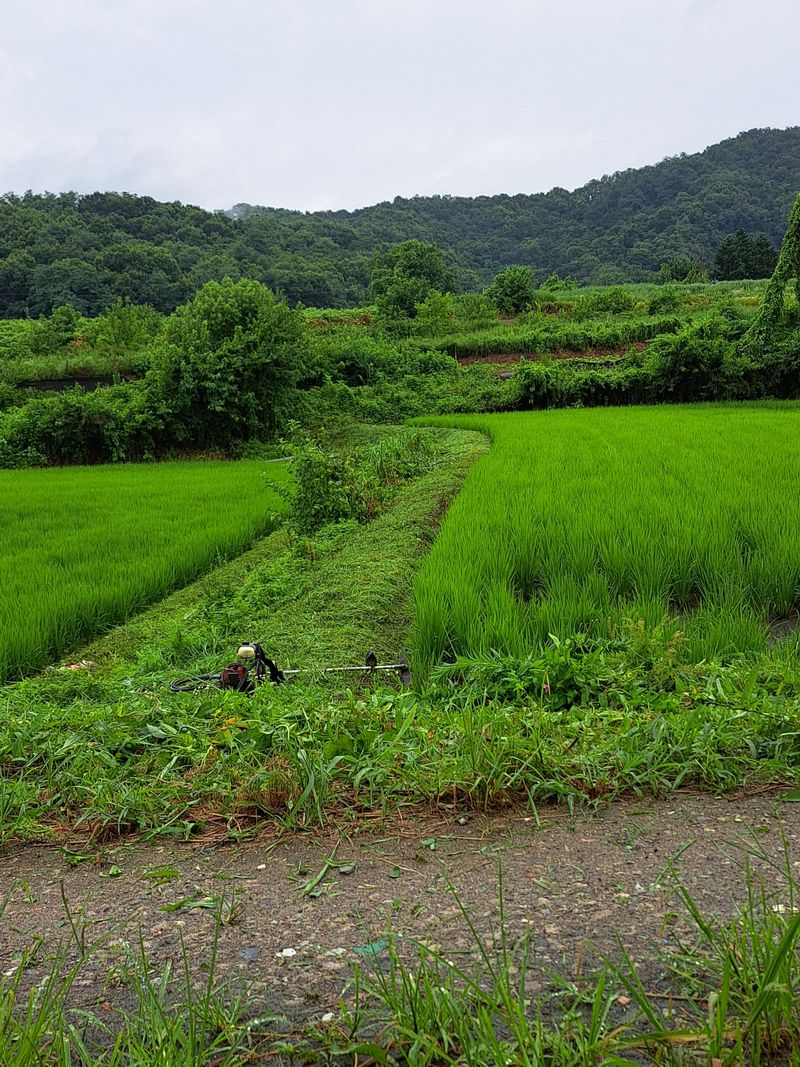 논 두렁제초작업 너무자란 두렁풀 비맞고 예취기 했습니다