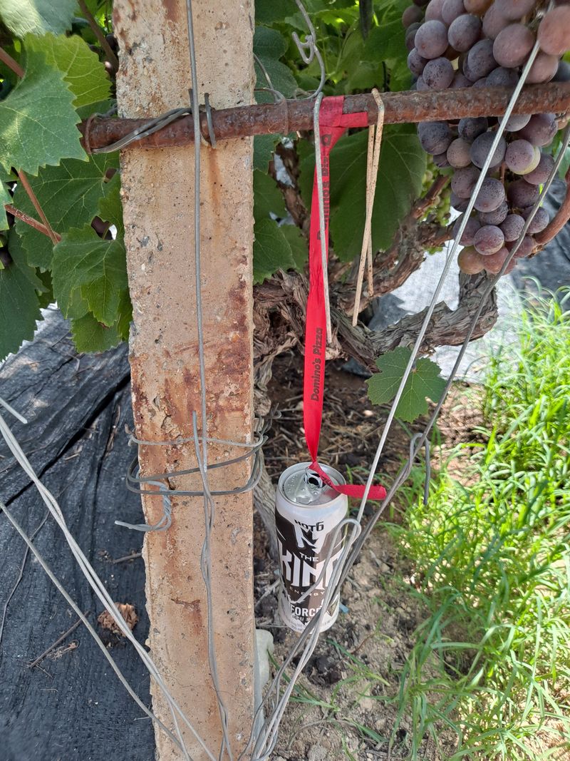 신초정리,알솎기 머루,샤인밭에 두더쥐,너구리 경고성 캔 달기,나프탈렌 달기 힘들다.너구리,새 상위 포식자들. 너구리 포도 익기를 호시탐탐 노리며 나무 주위를 돈다.꼬리 표시가 동그랗게 난다