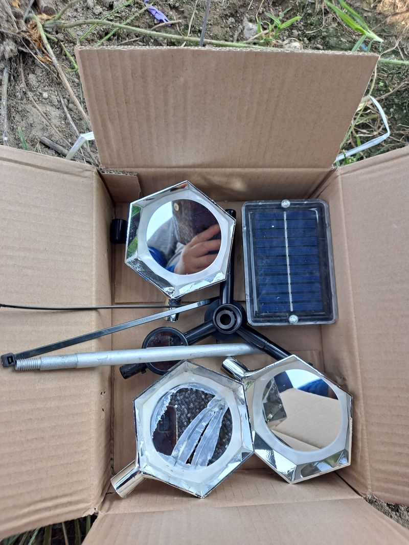 신초정리 조류 퇴치제 설치 , 들판 500평에 2개는부족한 듯 개소리,매소리 경적 갖가 소리와 반사경이 빙글빙글 돌며 반사 되어 일단 만족 몇 분 간격으로 나는데 확성기 추가 설치 해야 할 듯.가격이 비싸 고민됨 산 밑고라니 퇴치제 뿌리고 나니 너구리는 아니고 다림...
