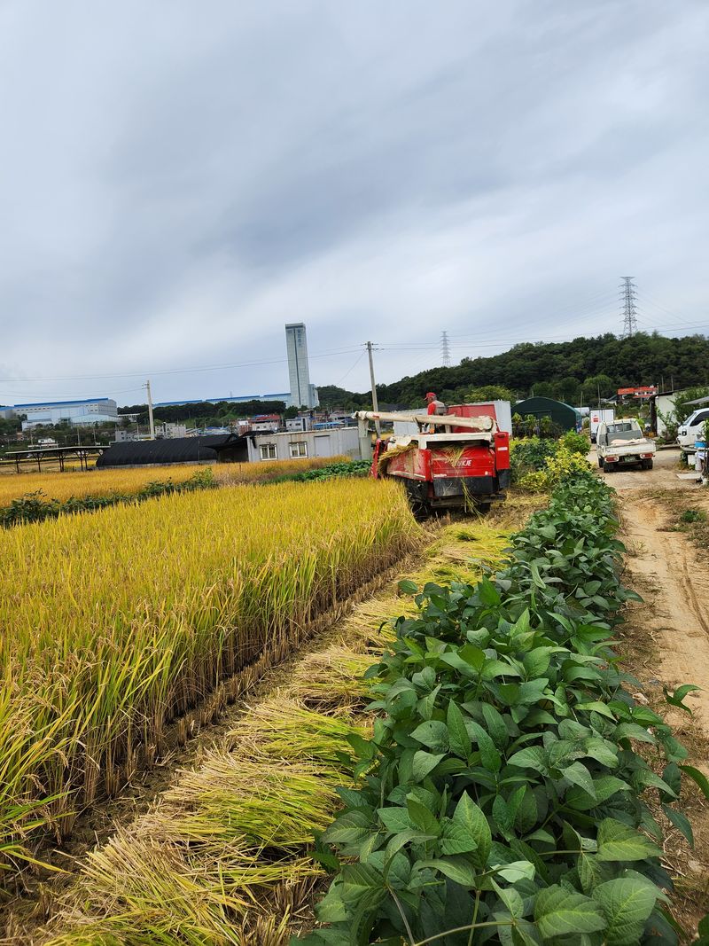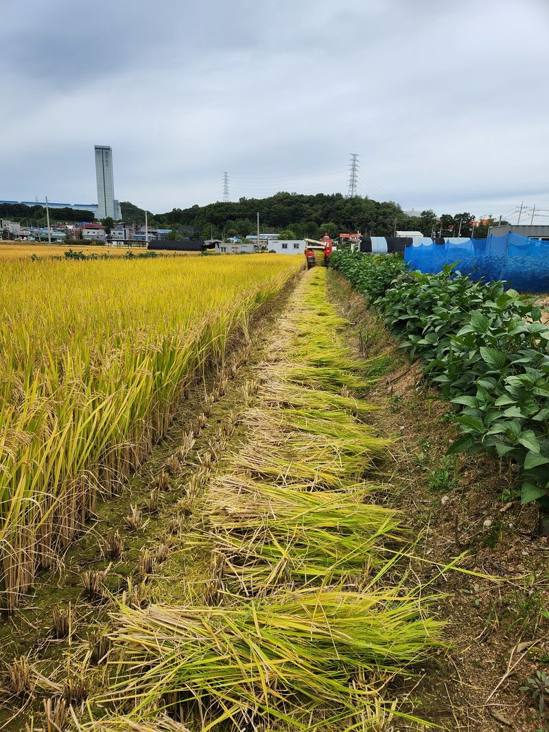 오늘은 수향미 벼 베기를 하였다 작년에는 작항이 너무 안조았는데 올해는 수확량 늘어 서 기분이 좋네요 800kg짜리 7곱자루 수매를 하였네요