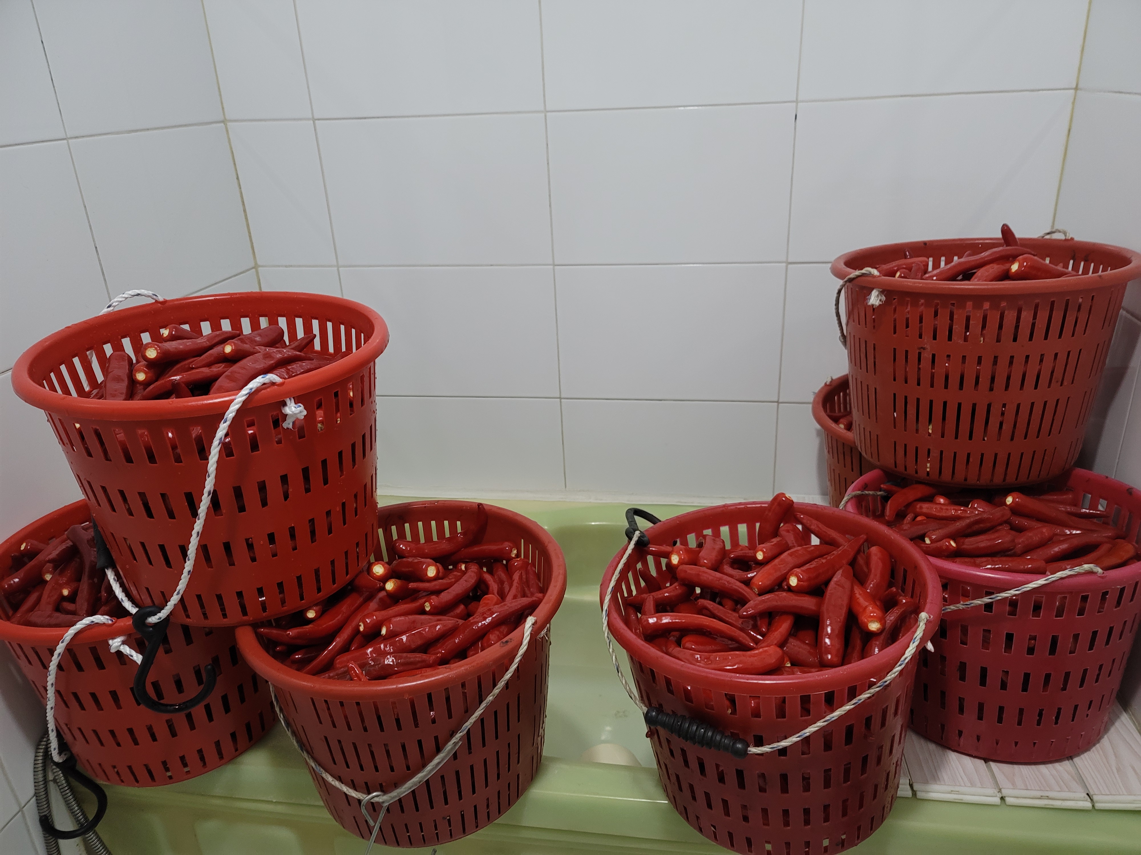 고추 씻어서 꼭지 따고 건조기에 넣기.