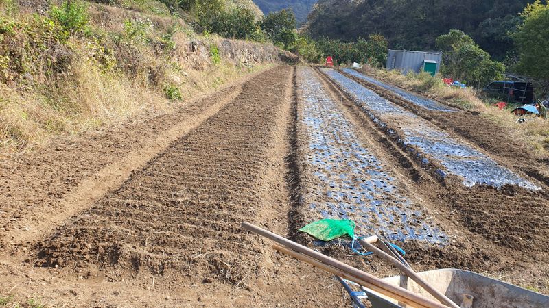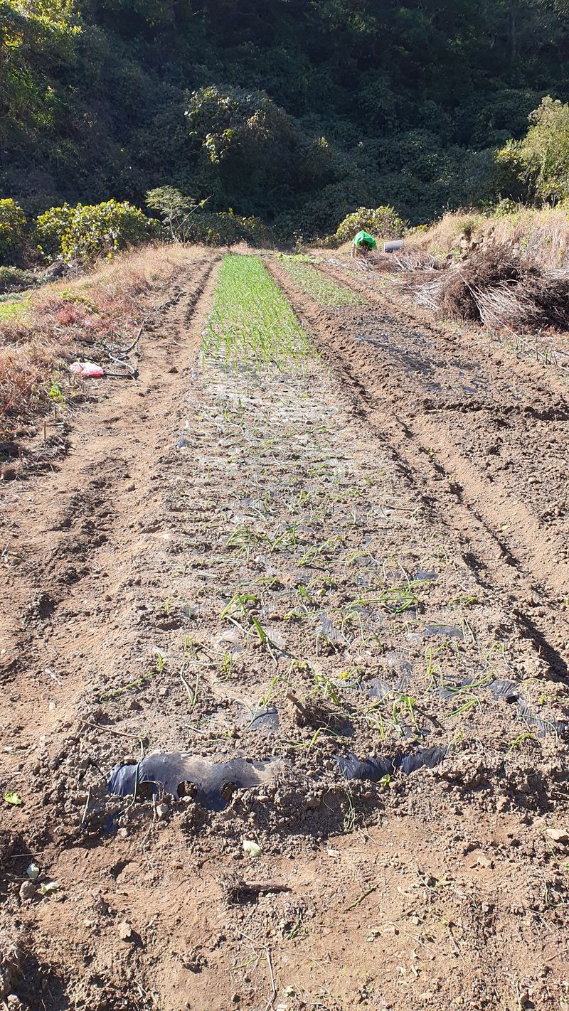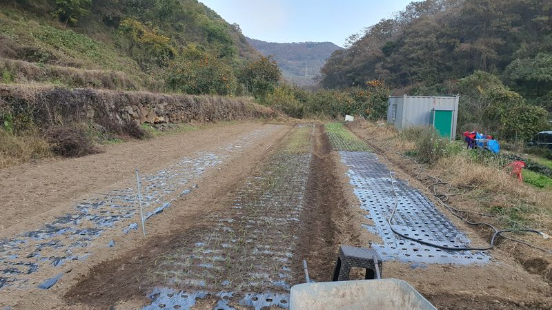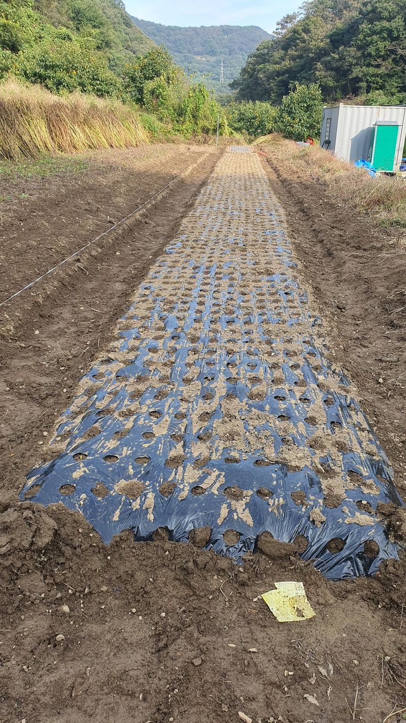 비닐멀칭 마무리하고 두룩지어 주아씨 심고 ,보리씨 뿌리고 마무리 하였습니다.