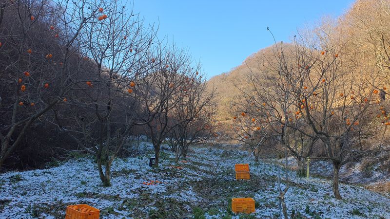 눈 싸인 농장에서 대봉감 마지막으로 수확 합니다.