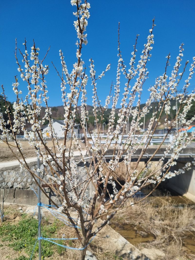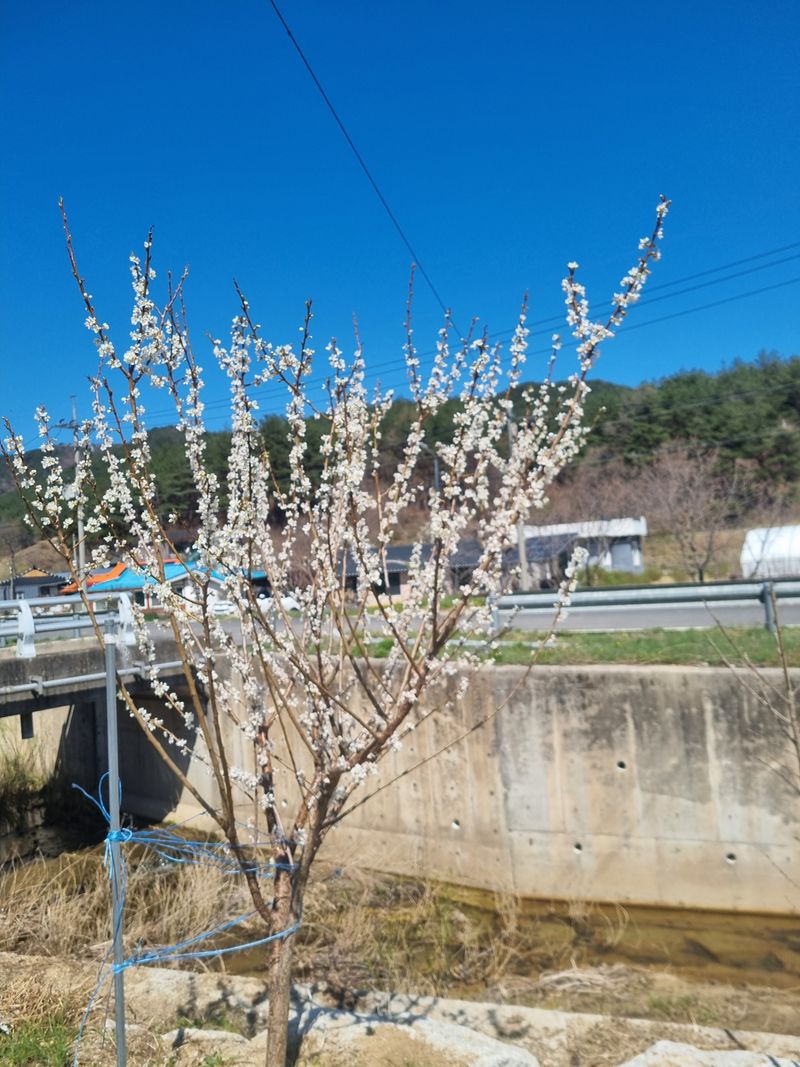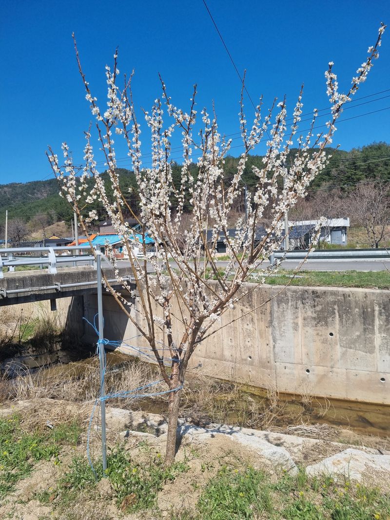 앵두 자두꽃이 피였어요ㅡ. ㅡ가시오이 5섯포기 심었어요ㅡ