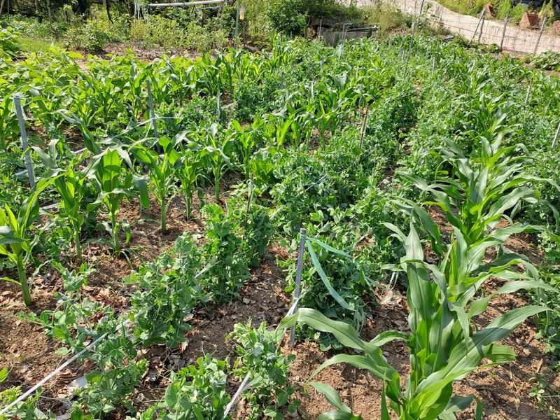 완두콩.옥수수.배추에물을2일에걸쳐주었습니다. 그리고통마토.고추가지치기를했습니다.그리고앵두도땄읍니다.