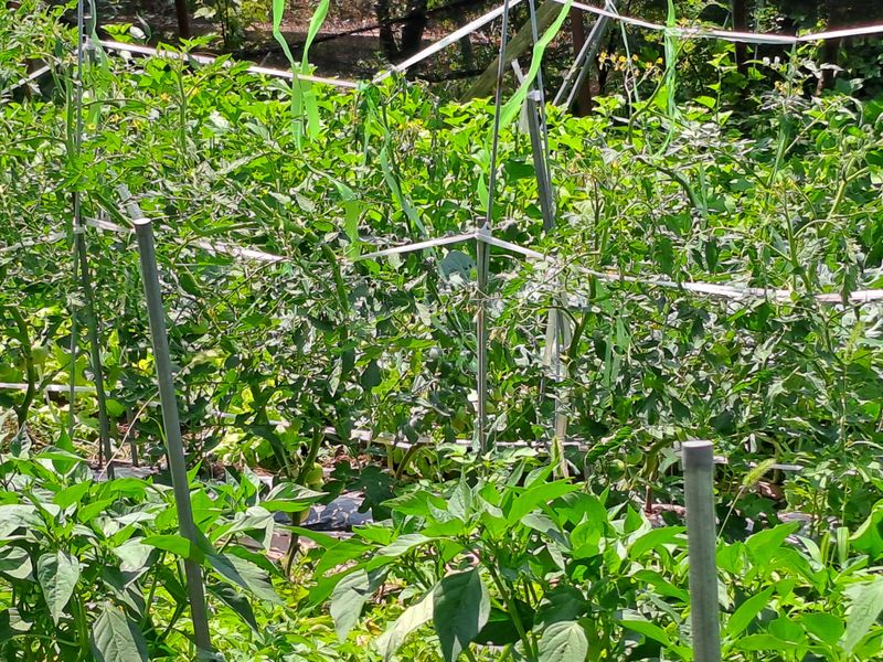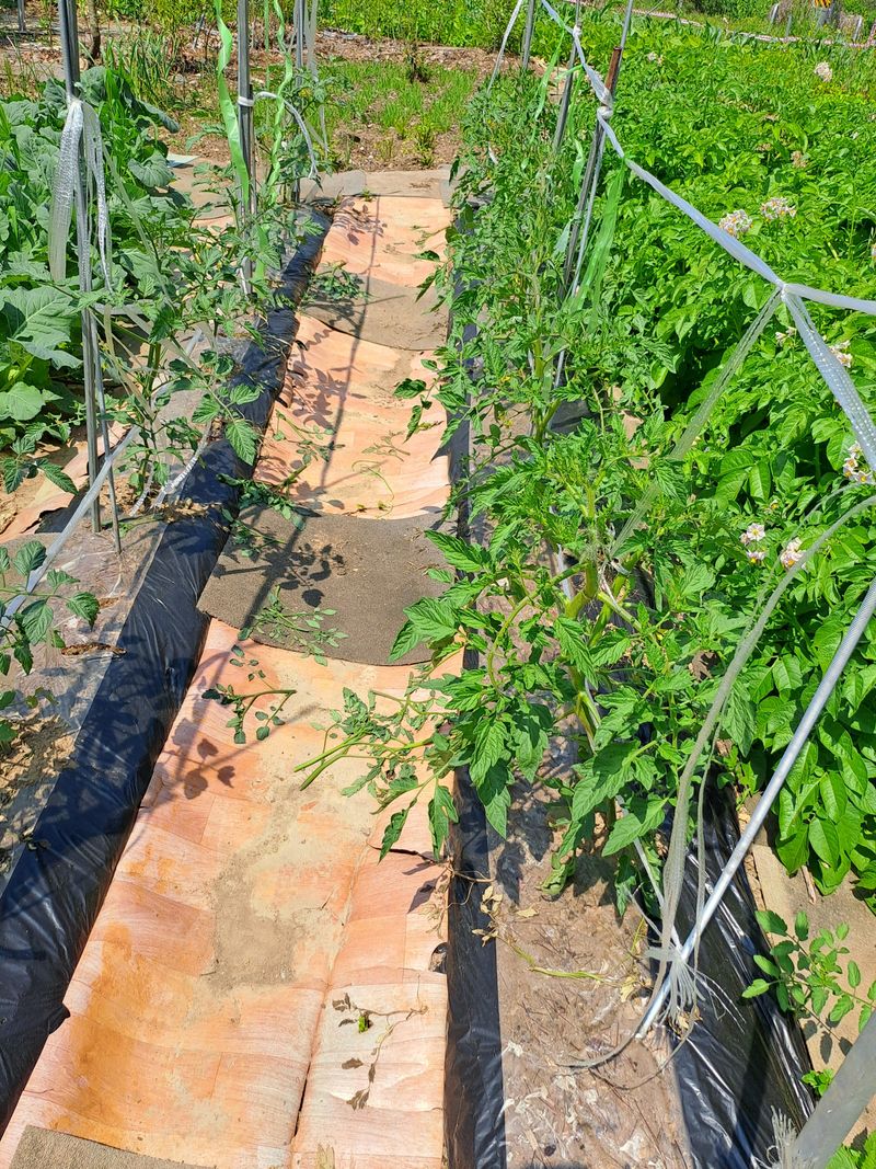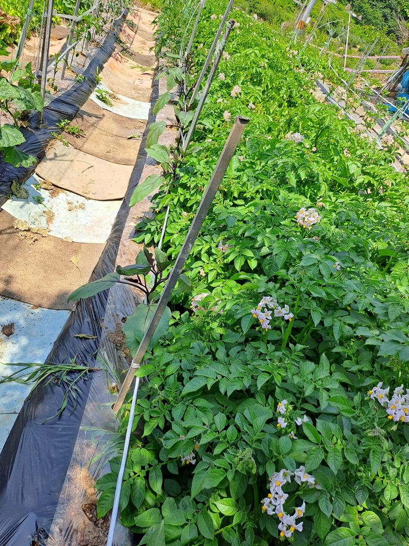 완두콩지주대박고줄띠우기했구요.고추.오이.가지.토마토등도 줄띠우기를마쳤읍니다. 감자꽃도예쁘게피었내요. 토종벌도한통들어서어제저녘에져다놓았습니다