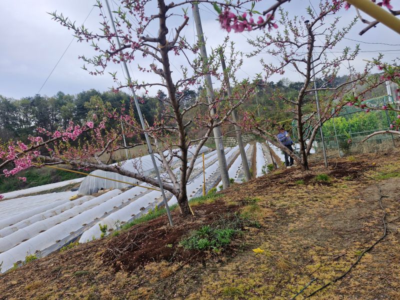 ♤2025년 복숭아 🍑 밭에 꽃이 피고나서 떨어지고 10% 정도 남 았을때 치는약 침 신천리1061번지 복숭아 🍑 밭에 ♤생강 심기 2틀째
