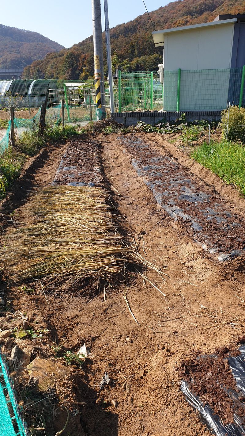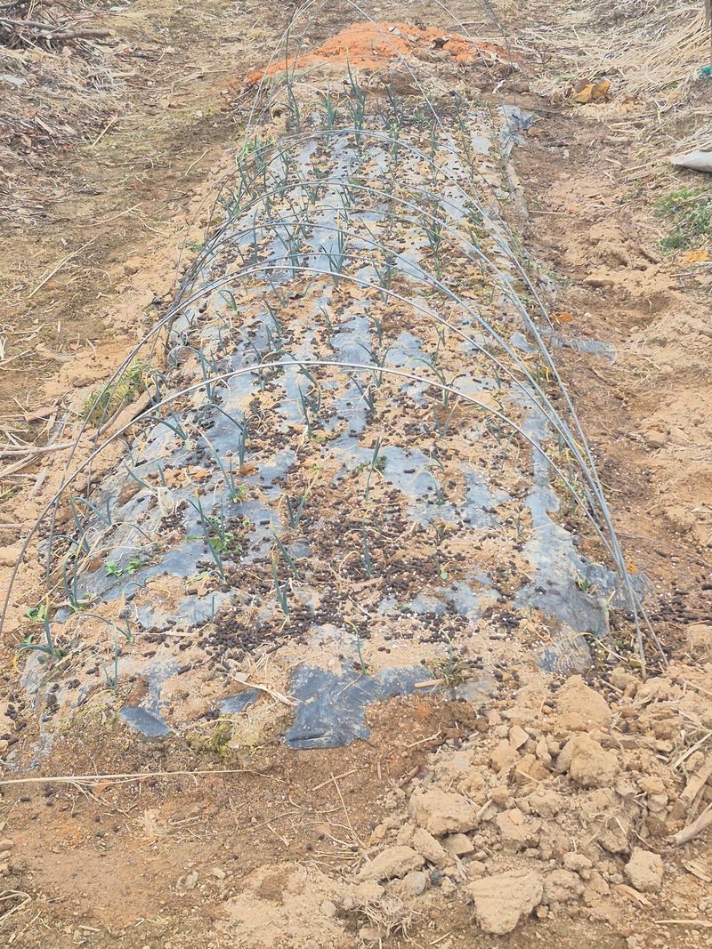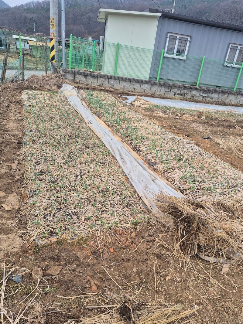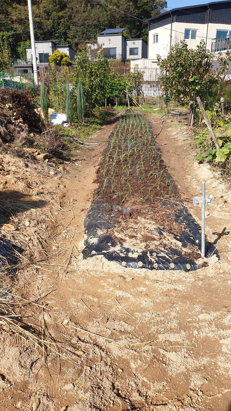 마늘순 비닐밖으로 내놓기 마늘 심고 일주일 지나니 싹이 올라와서 비닐 밖으로꺼내어 부엽토 거름으로 주변눌러주며 추위전에 뿌리활착시켜서 윌동 보온준비합니다