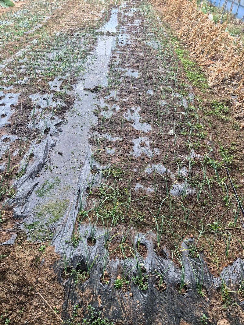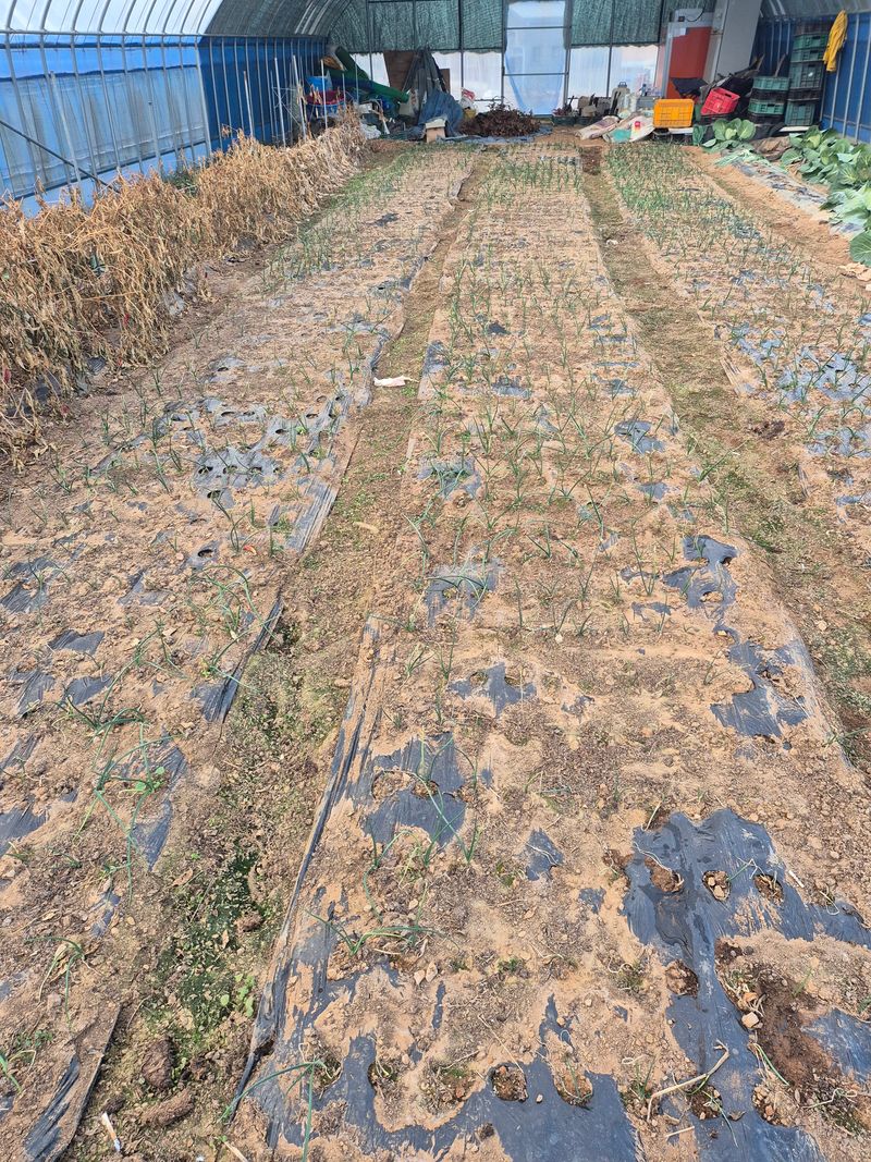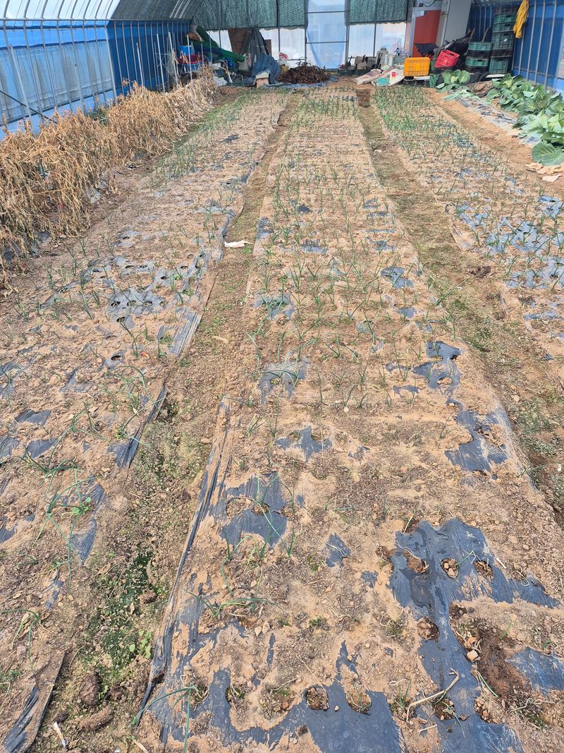 더 춥기전에 양파 물주기 하우스 안에서 자란 양파 물이 부족해 군데 군데 말 라가네요
