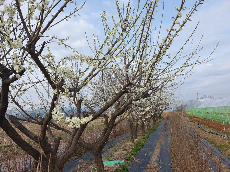 오후편스밑 골정리,부추물주고,바람세게불어 매실 약살포 못함