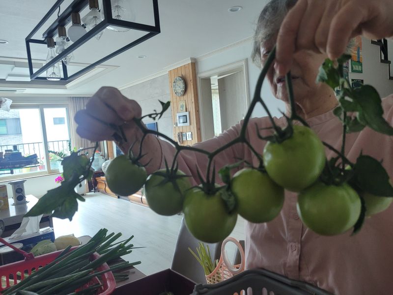 장마철이라 토마토가 터지고 무르고 그래서 아직 익지 않은 토마토도 따서왔다