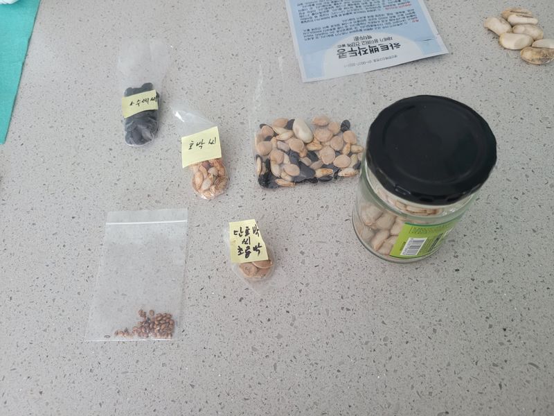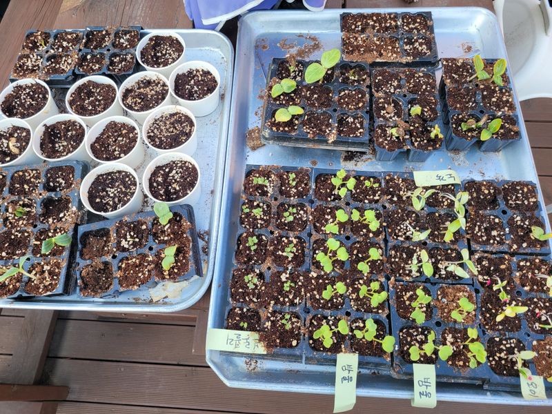 뽀골뽀골 브로콜리 빨간 방울토마토 노각오이,조선오이 포트에 파종했지요. 백봉 샹리 보우짱 수세미 맷돌호박 조산호박 등등 호박종류만8가지, 싹틔우기 하느라 소주컵에 물담아 담궈두었죠. 작두콩 11알 물속에 첨벙!!!!! 2025년 농사 요이 땅!