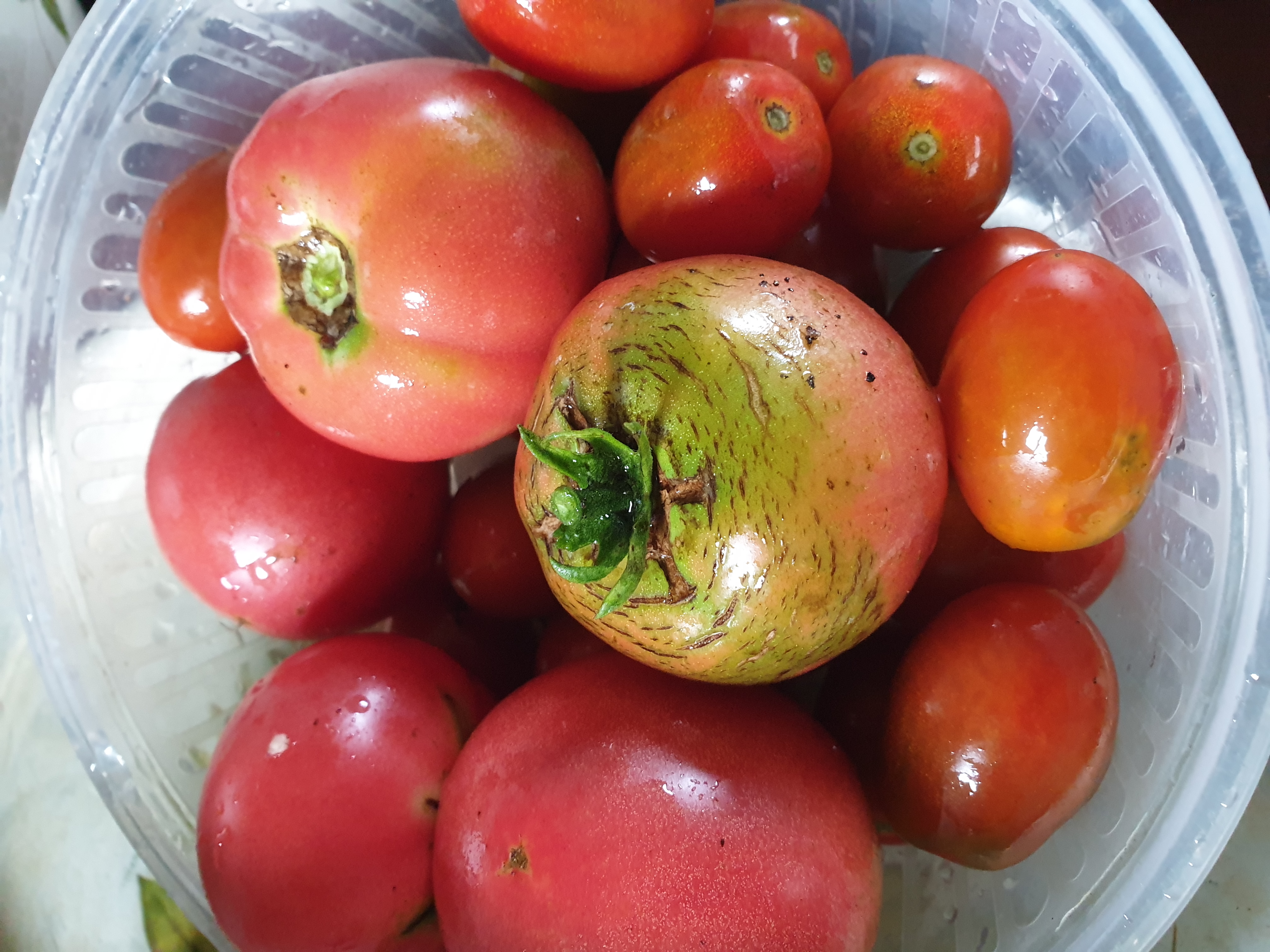 방울토마토와 토마토 먹을거 땄음. 참깨 풀 뽑고, 빈데 옮겨심기