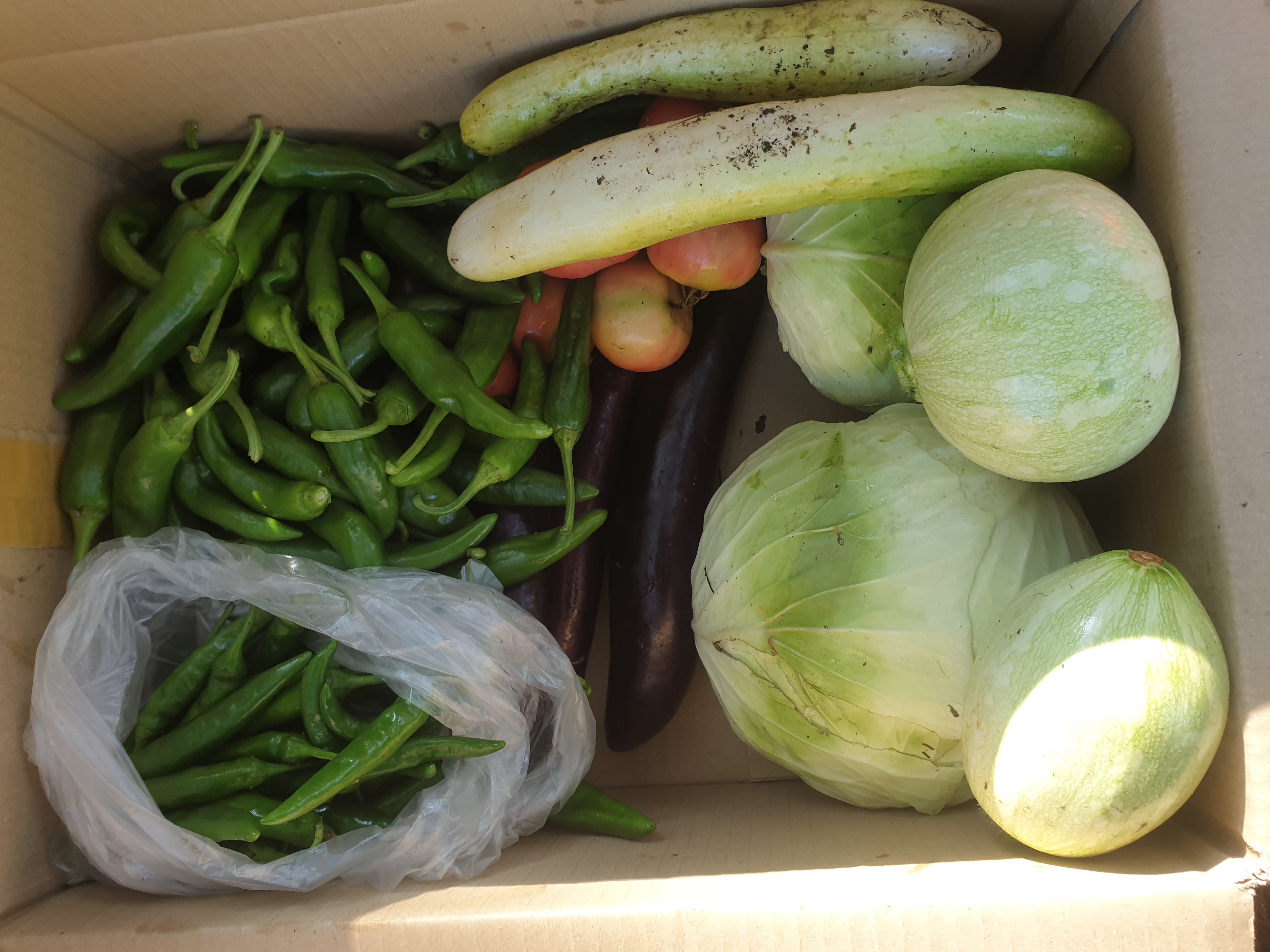 풋고추 땀 양배추 8통, 브로콜리 20여개, 가지, 오이, 상추, 치커리, 아욱, 미나리, 들깻잎