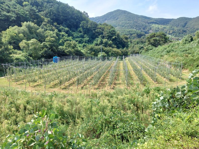12년차 사과 미안마 올해도 3차 적과 끝내고 우거진 가지 치기와 여름에는 잡풀이 1달에 2번 이상 자동애초기로 풀을 제거 해야 하기에 바쁜 일상이다 우리사과 농가는 제초제를 쓰지 않기때문에 늘 바쁜 일상이며 농사는 주인의 발자욱 소리듣고 자라듯이 영글어 가...