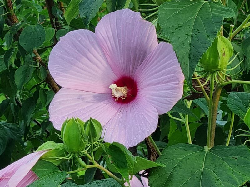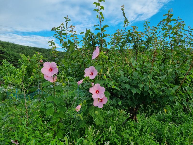 나무가지가 또 위로 뻗어나갑니다. 가지치기와 예초작업하였습니다! 매실옆에 부용화가 화사하고 큼직하게 피었습니다 ^^ 나팔꽃도 보입니다.
