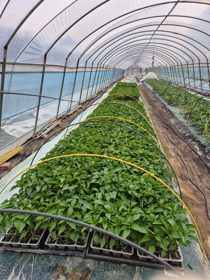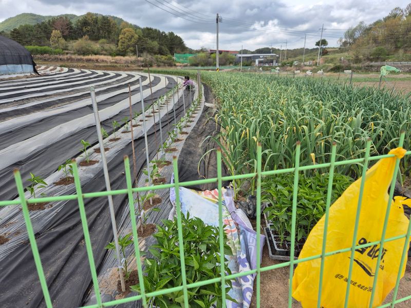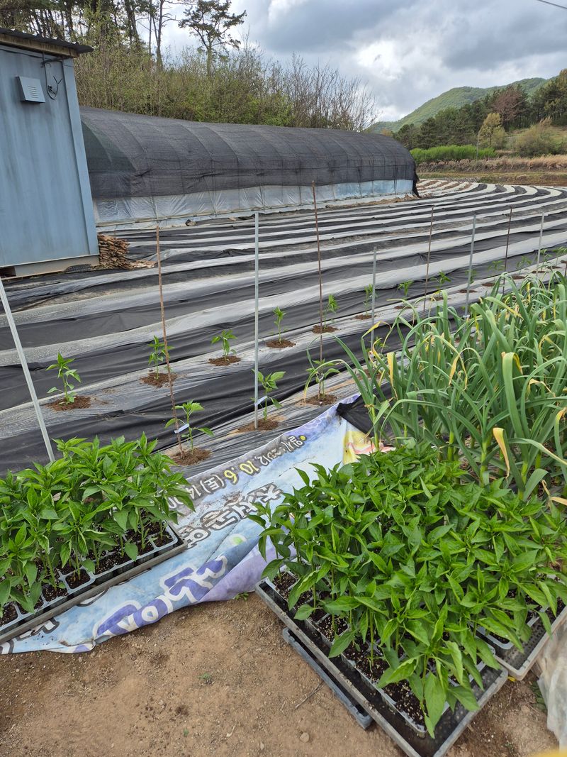 고추모종 심기작업을 했습니다 집사람은 심고 나는 한포기씩 지주대 세우고 결속기로 묽어주고 허리도 아프고 포기수도 줄였지만 힘드네요 팜모님 이웃님들 오늘도 화이팅 입니다