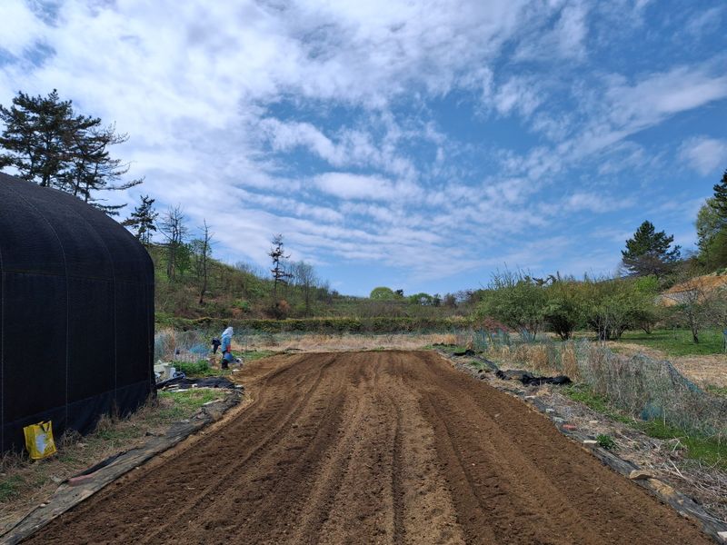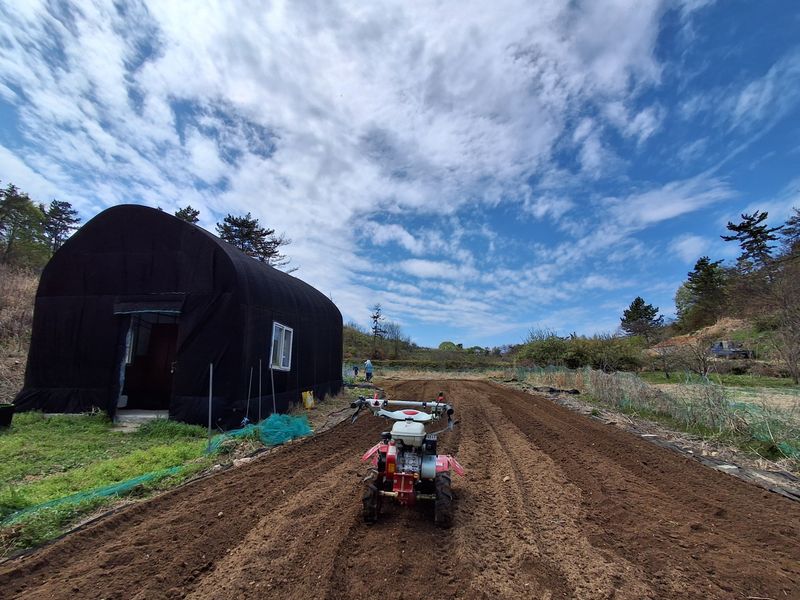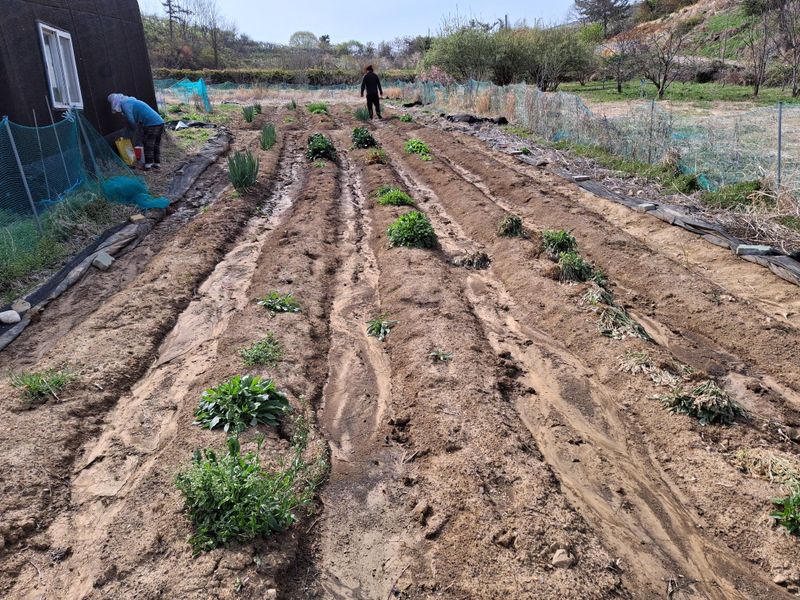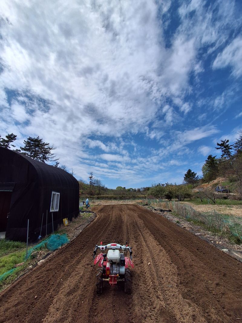 4월13일 노타리기계로 전년도 고랑을 땅을 부드럽게 평탄 작업 하였다