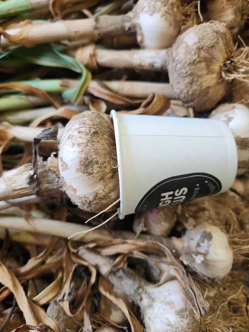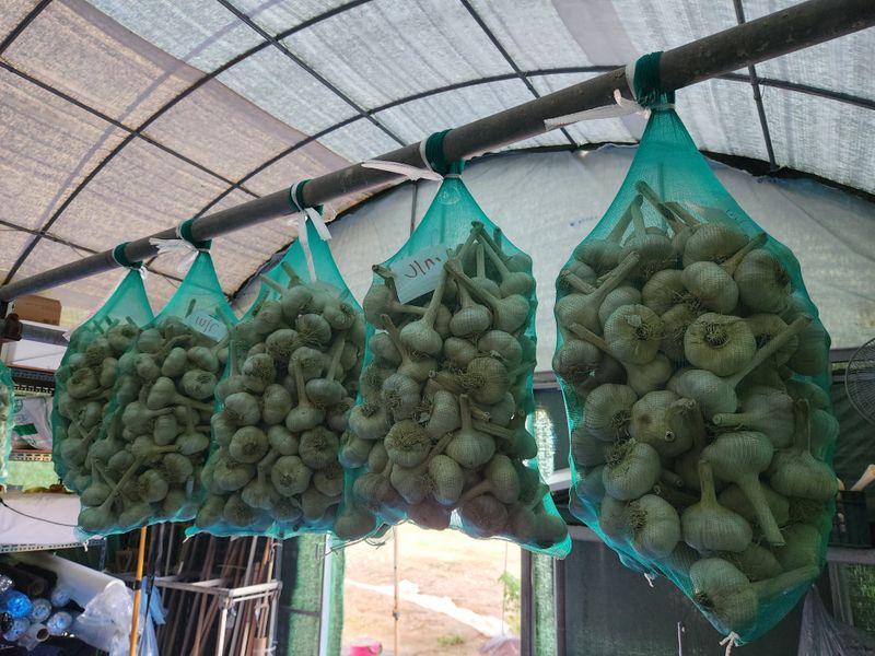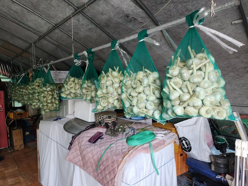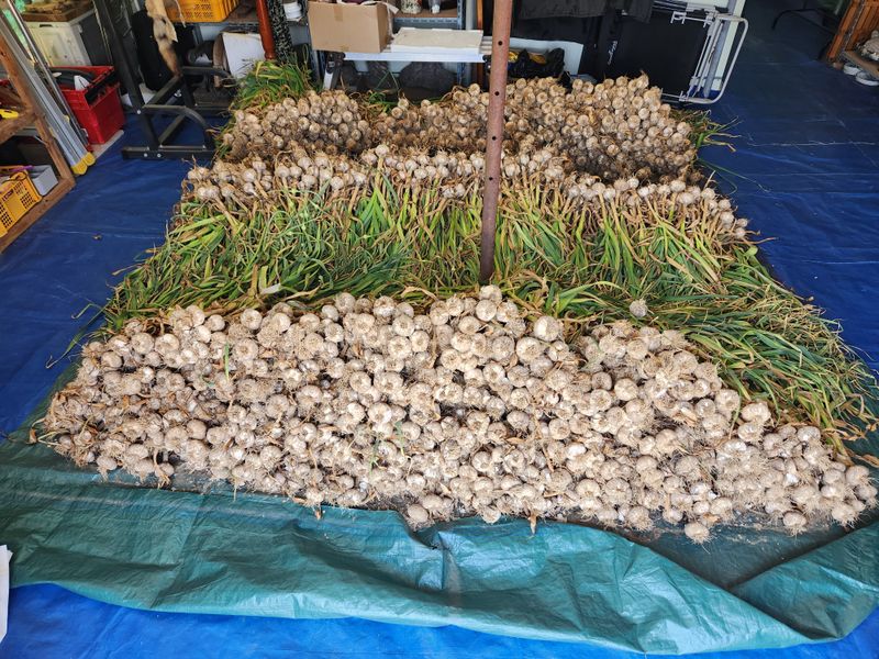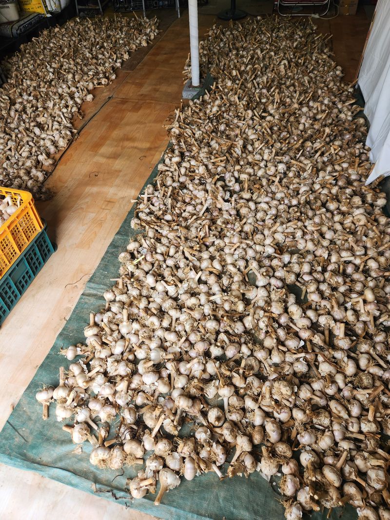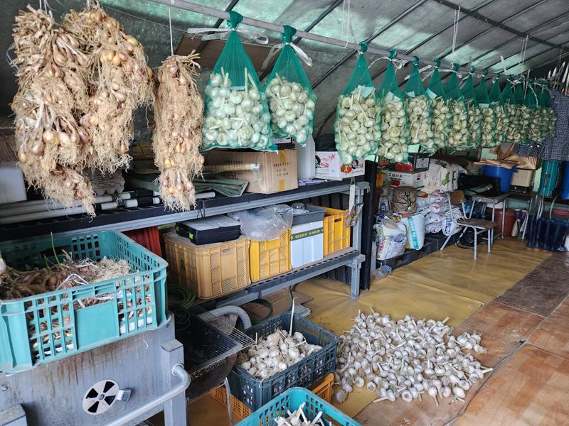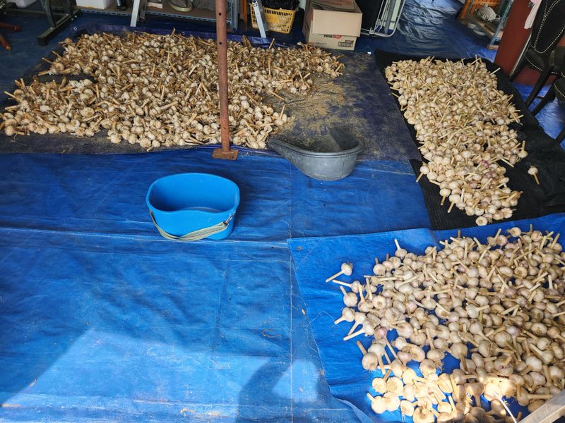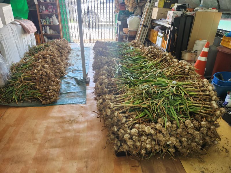 홍산마늘을 오늘 수확 했습니다 토요일쯤 비예보가 있어 하우스창고(1),하우스창고(2) 여기저기 쌓아 놓았습니다 썩지는 않겠지요 마늘싹이 엄청굵었는데 마늘은 기대치보다는 작은편입니다 종이컵 크기만 합니다
