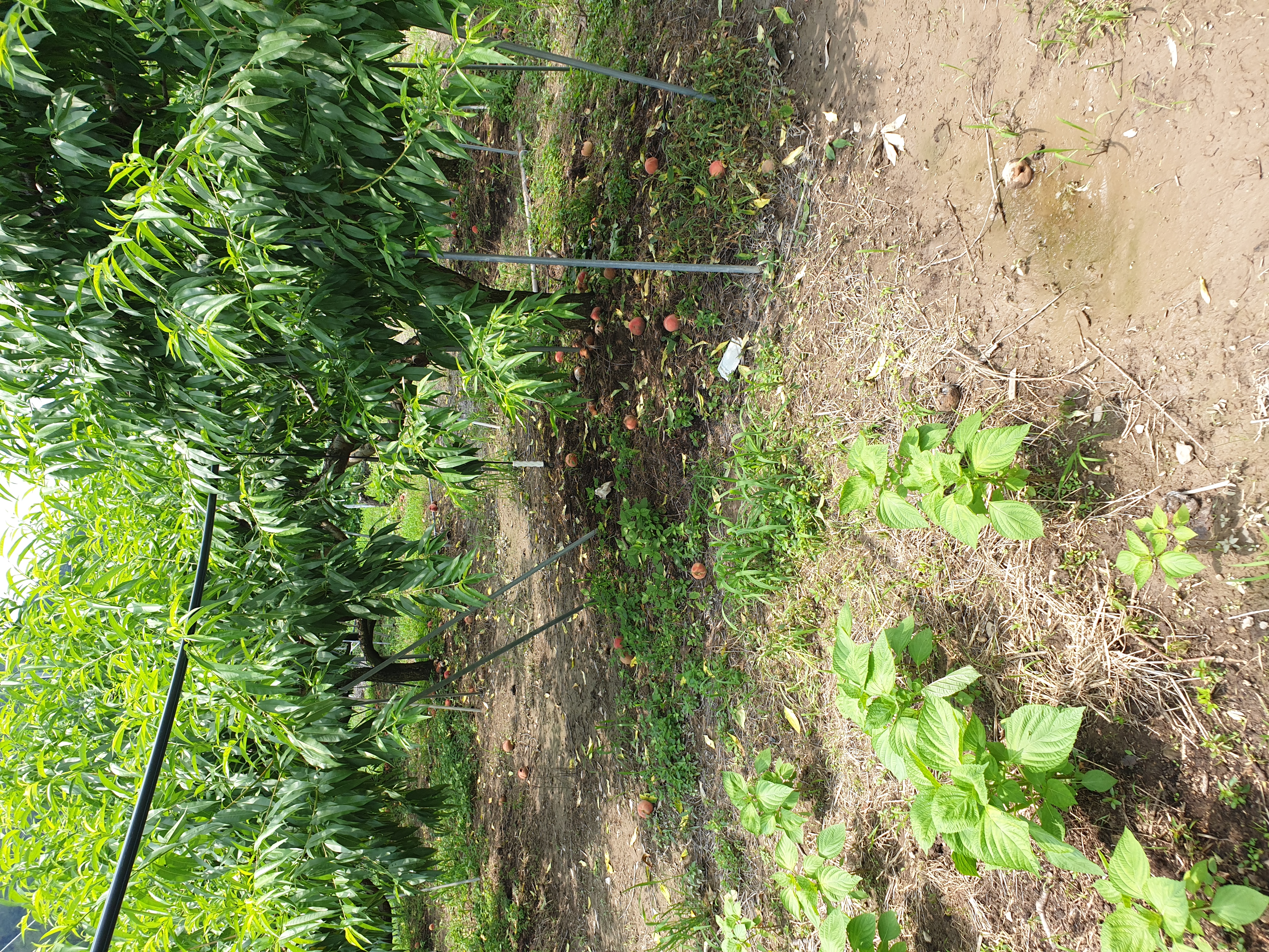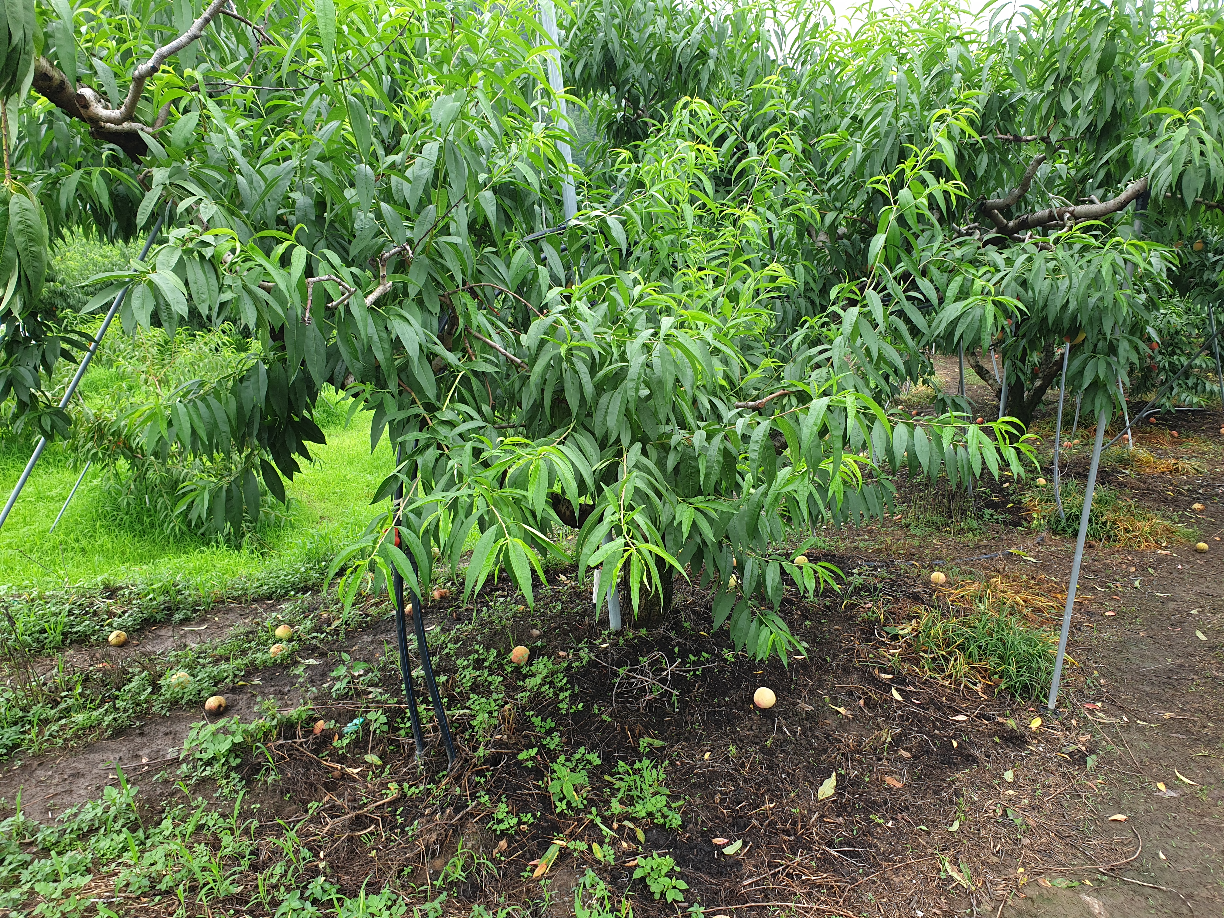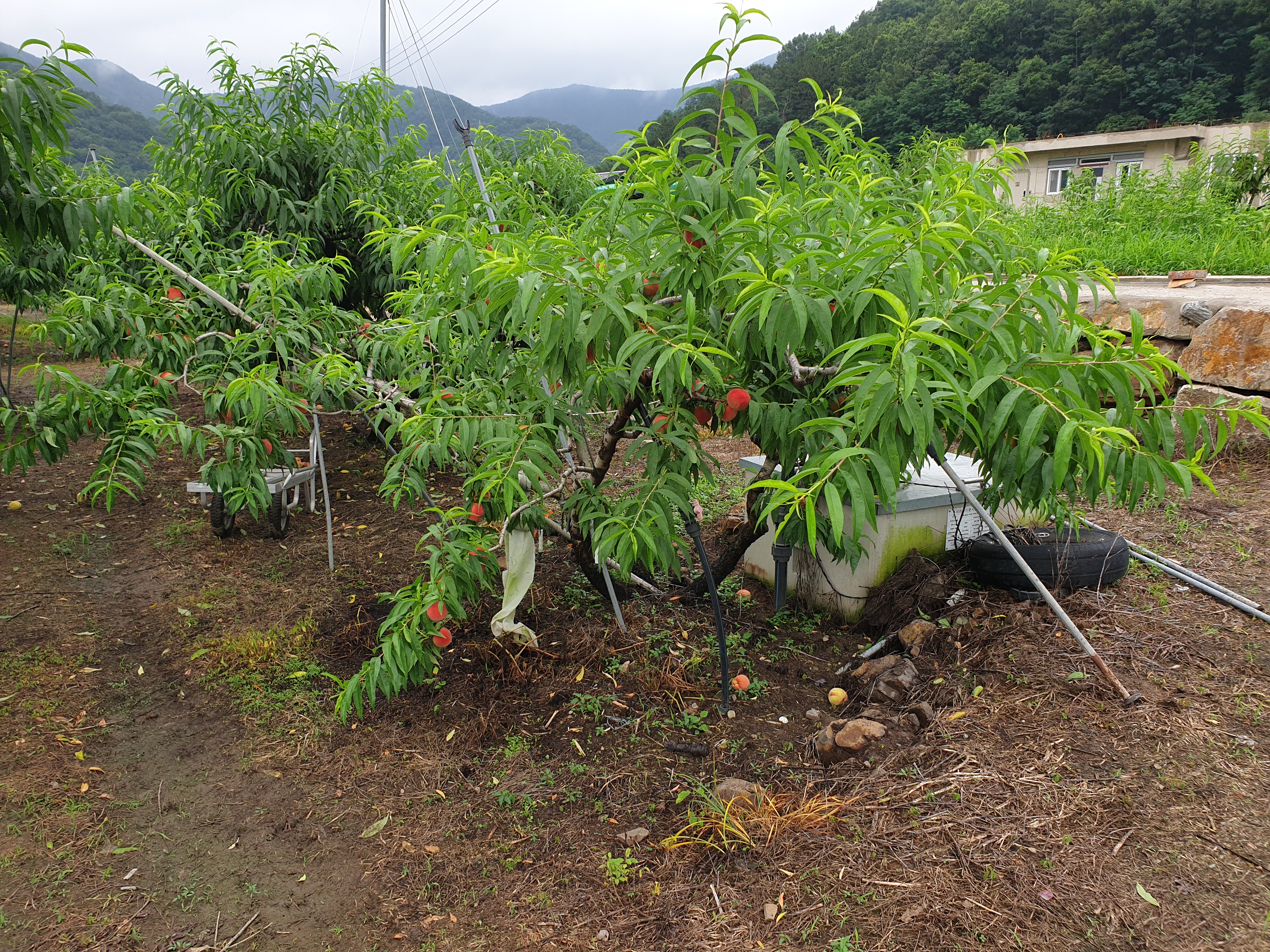 바가 소강상태라, 과수상태 및 배수로 확인. 비가 그치고 맑으면 약제살포예정(① 탄저병 발생이 많습니다. 10일간격으로 약량을 늘려 골고루 방제② 세균성구멍병 발생시는 정기방제사이(5~7일간격)에 맑은아연보르도액 또는 옥솔린산, 싸이클린 살포 ③ 수확전 (7월중순~말...