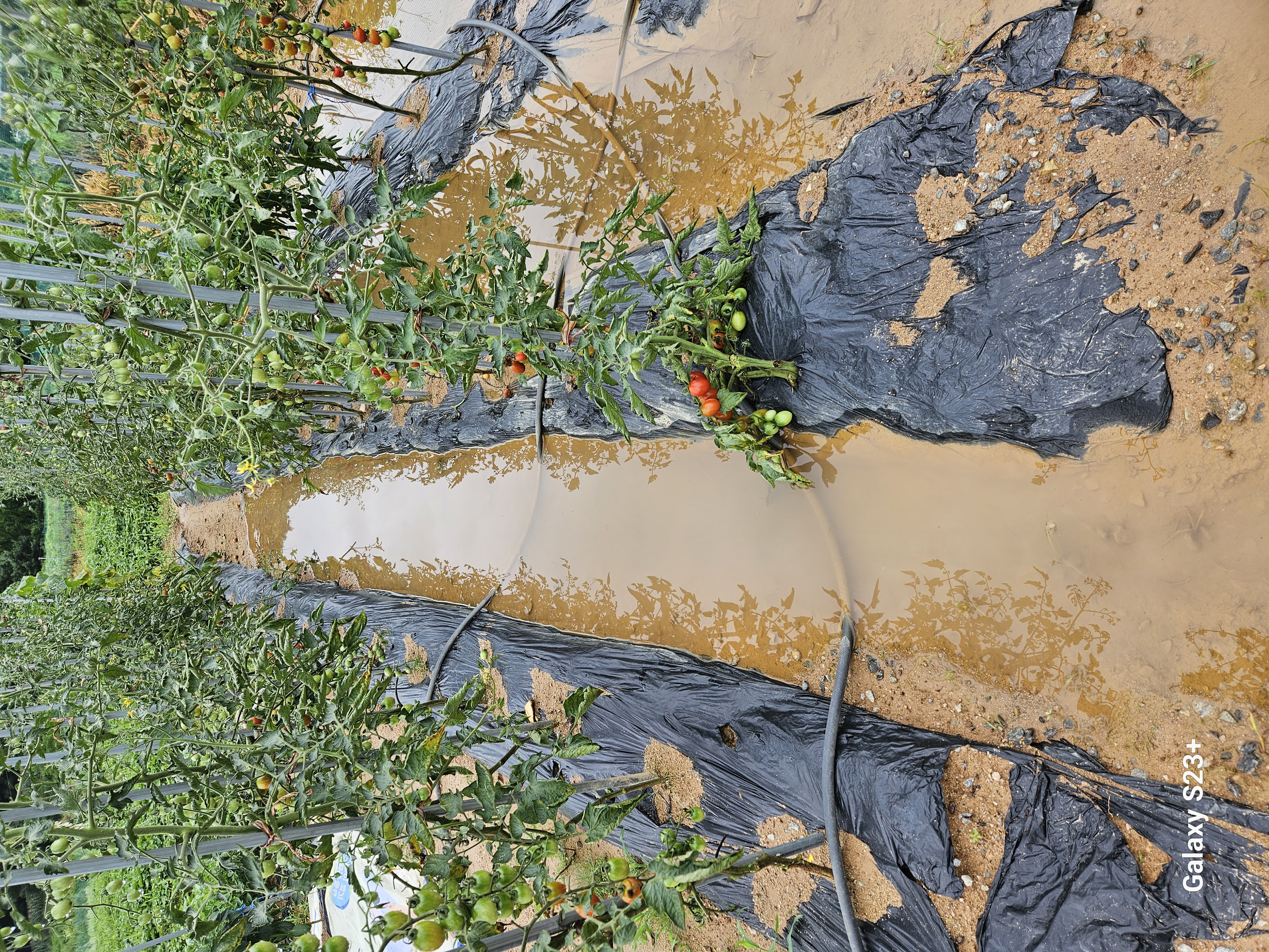 토마토. 잎이 오그라 들고 있네요 왜 그럴까요 장마 비에 많이 떨어지고 터지고 왜 이래요 속상하게 손주들이 오면 따야 되는데~~~