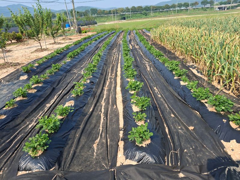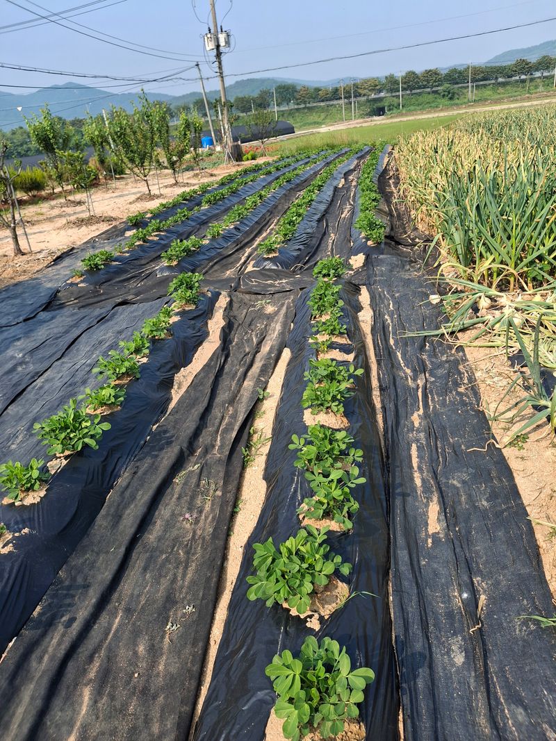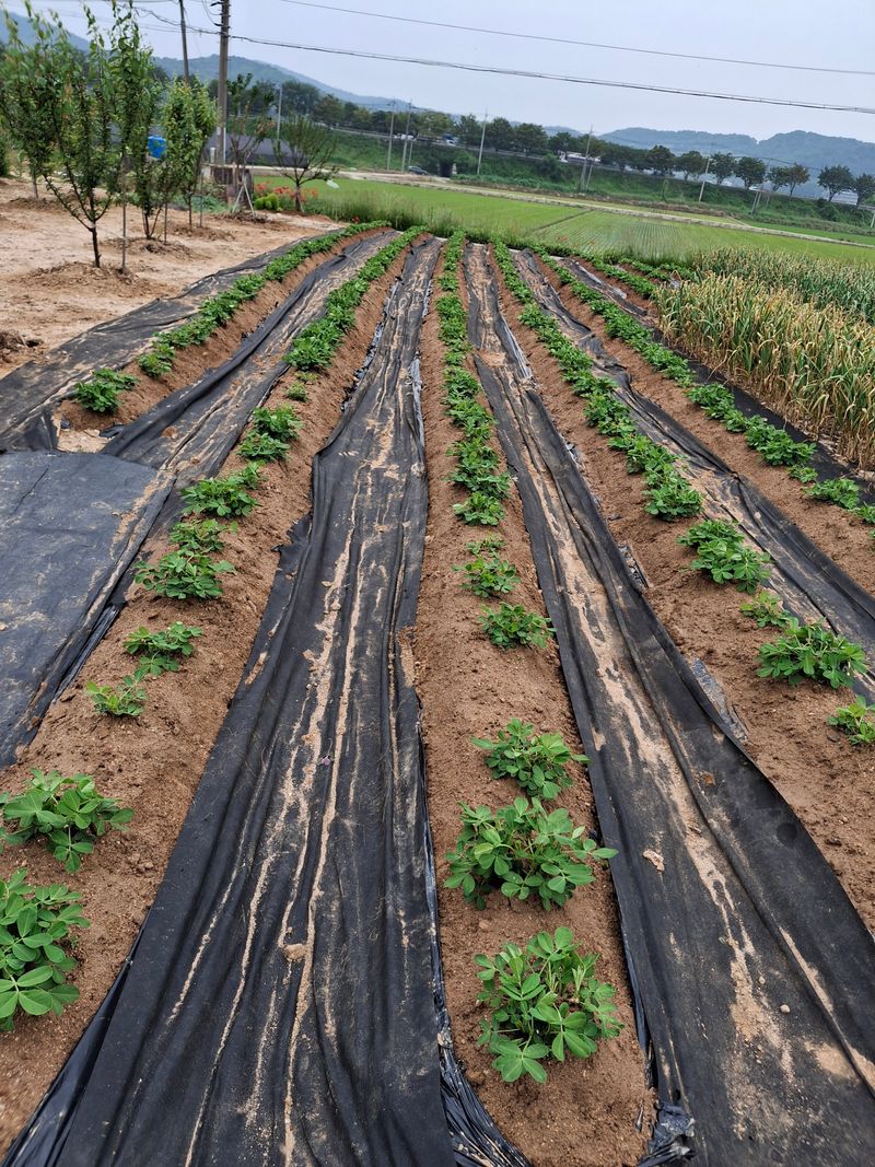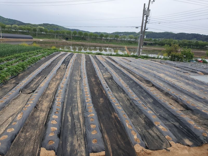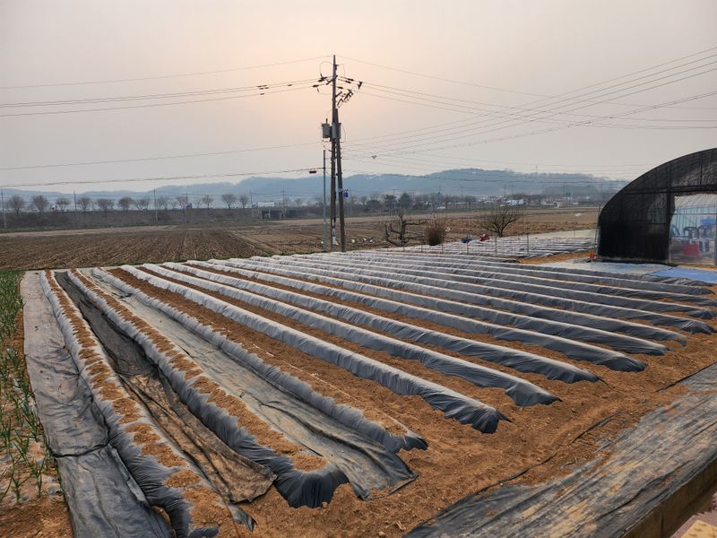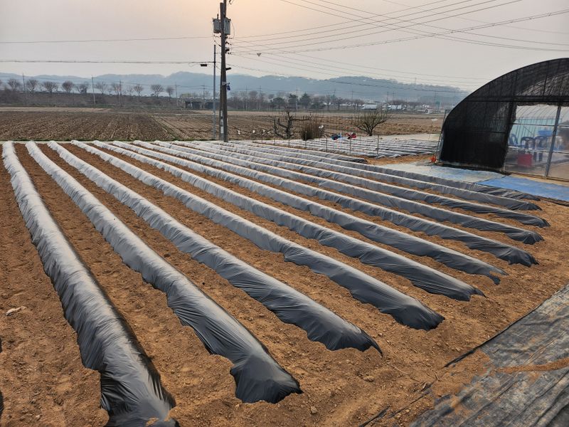 비닐멀칭 하나 하나 골에 식물 씨앗을 심어 밭고랑이 가득하게 만들어야 하네요 화단엔 봄꽃이 피기 시작 합니다