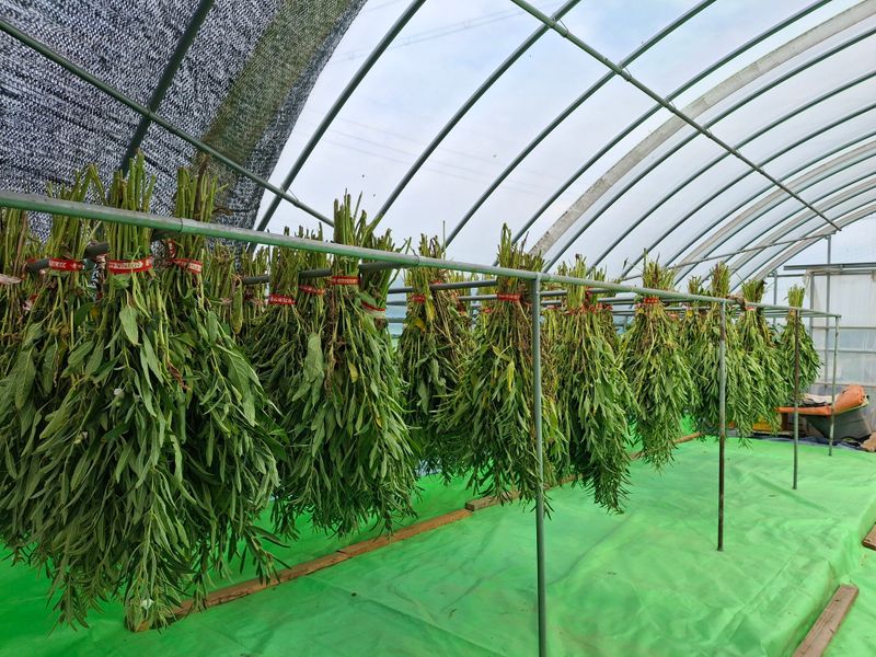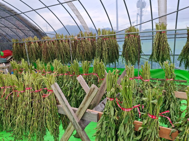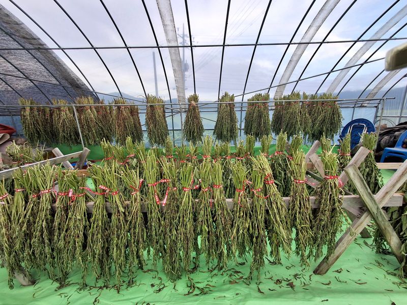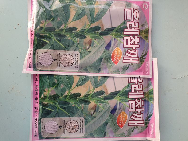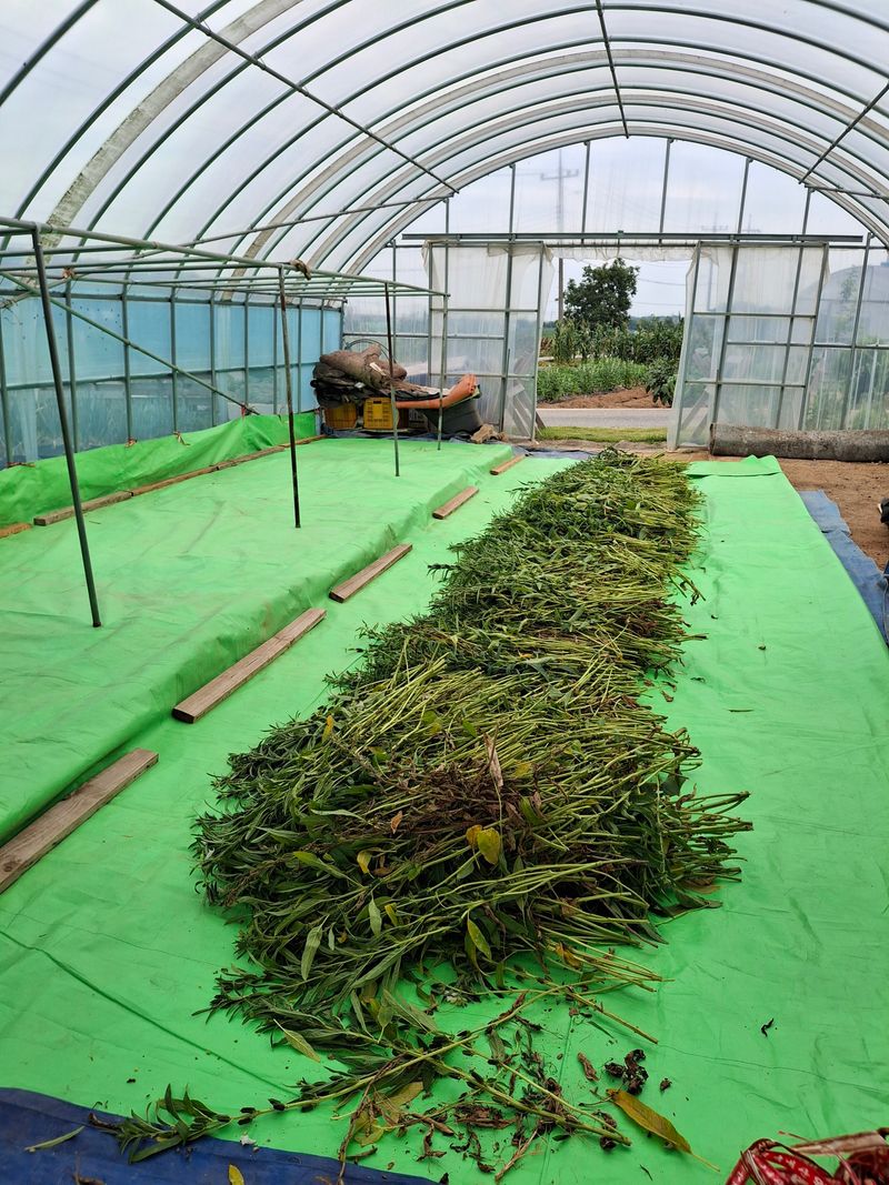 입이 벌어지기 시작한 참깨 베어 하우스에 걸어두었네요. 날씨가 더워서 일주일빠르게 수확했네요.
