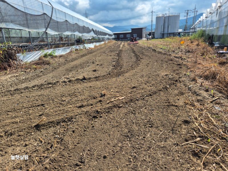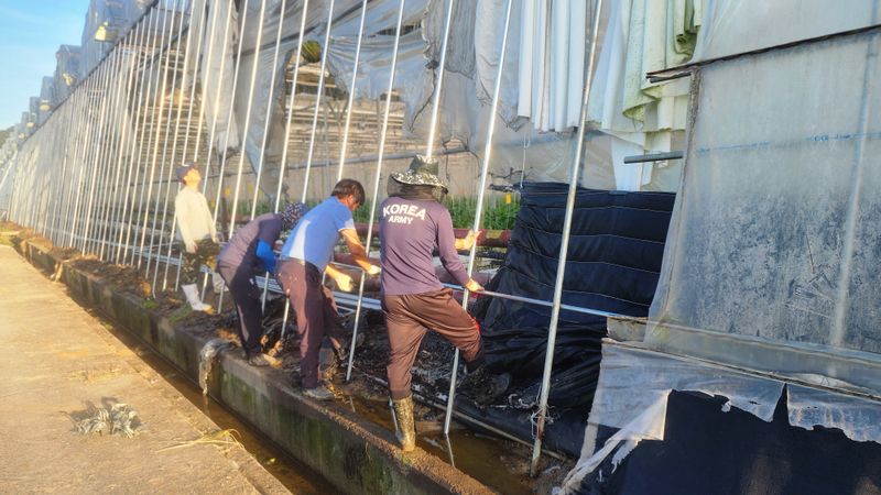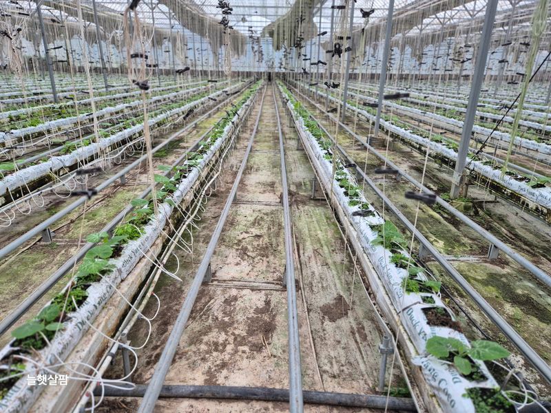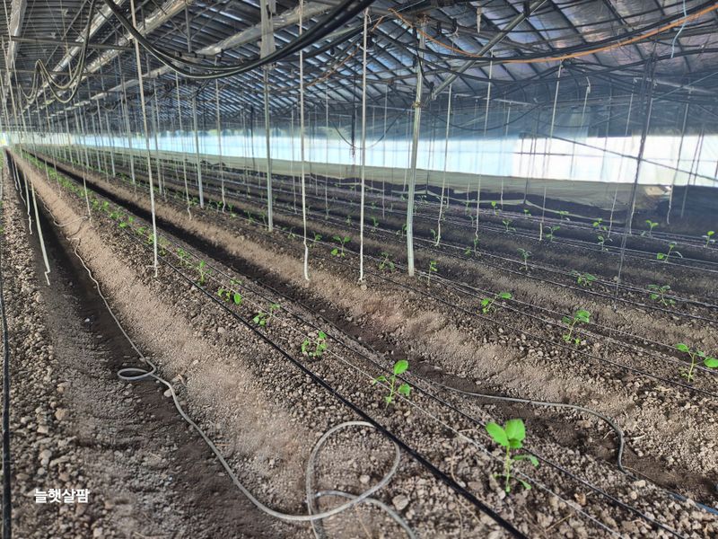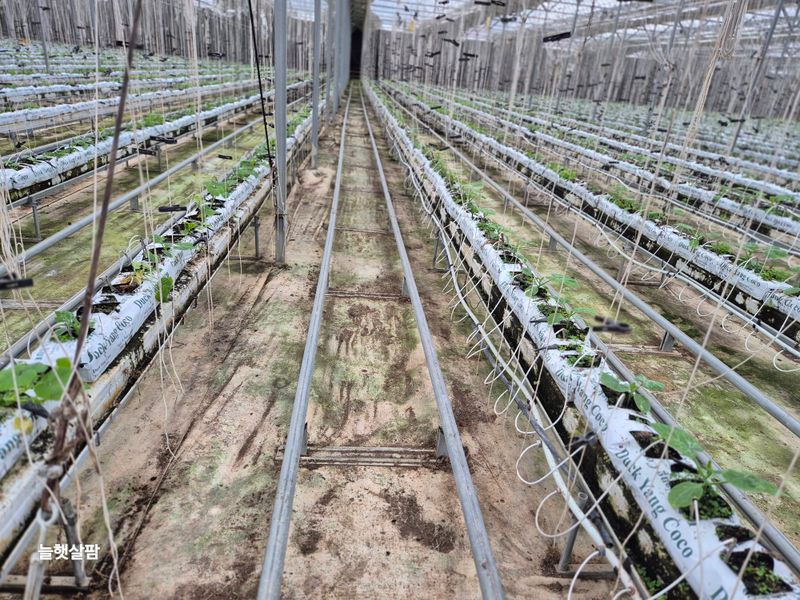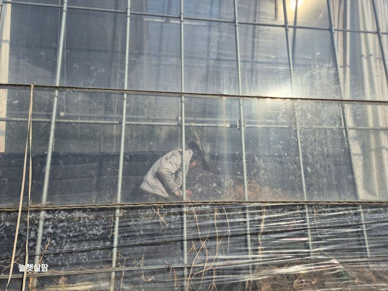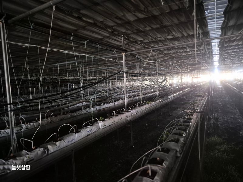 맑음 피망 새싹 저장고에서 밖으로 저면관수 진주식 하우스 트렉트 작업 논 갈기 개천 하우스 철거 작업