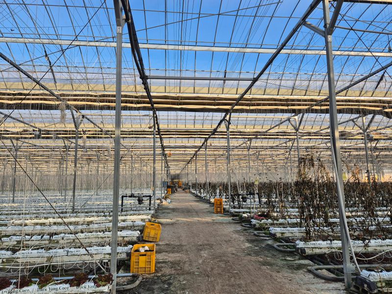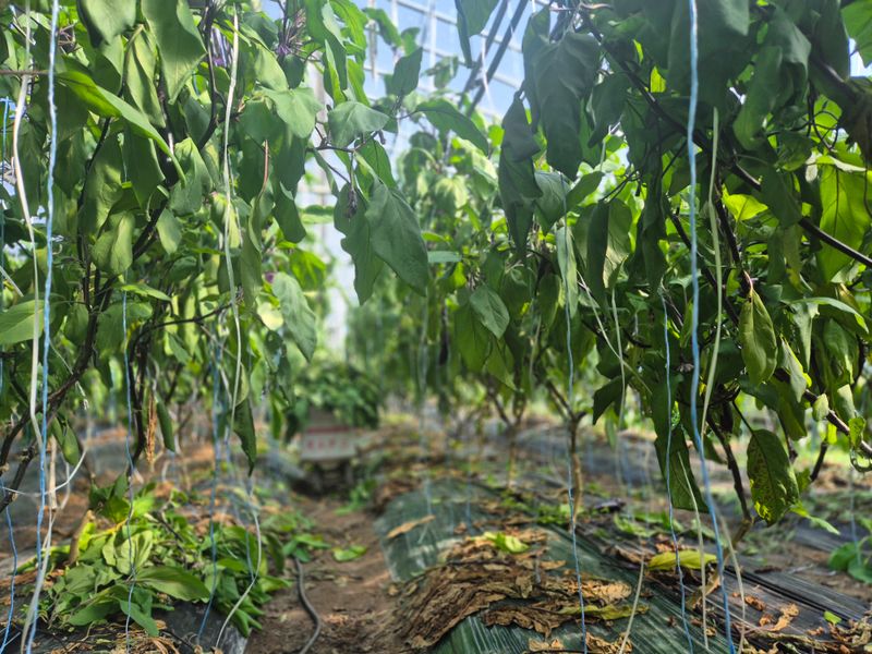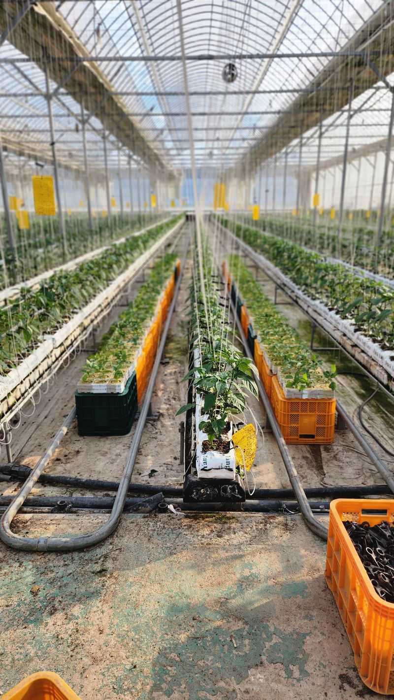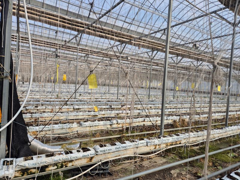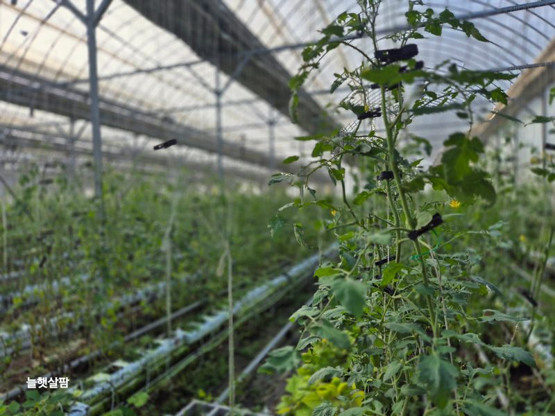 1,락스 집게 소독중 2,줄내림과 집게 작업 파프리카 나무 잡아 줌7반(11줄반~2일째) 3,양액 700~500낮춤 물이 부족 4,늘햇살팜 영상 올림