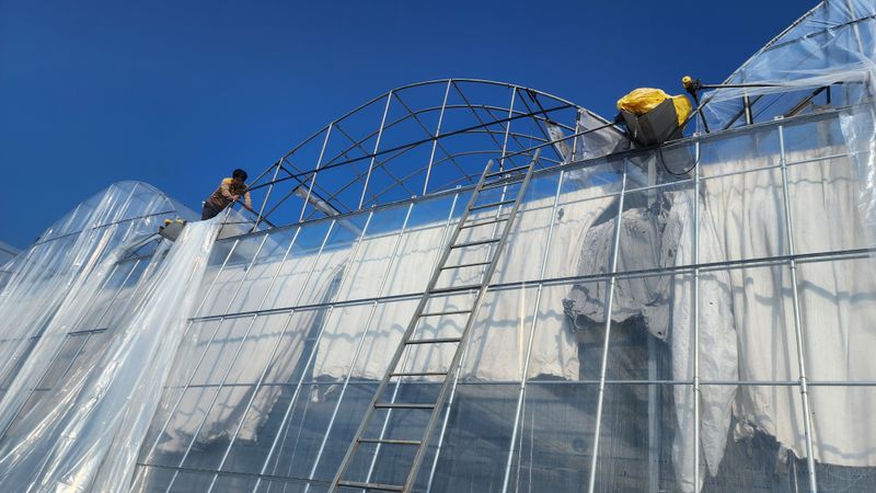 맑음 비니루 2동 벗기고 환기창 비닐과 개폐기 파이프 갈기