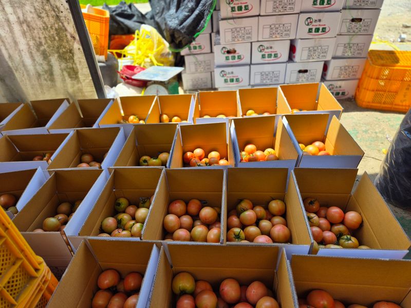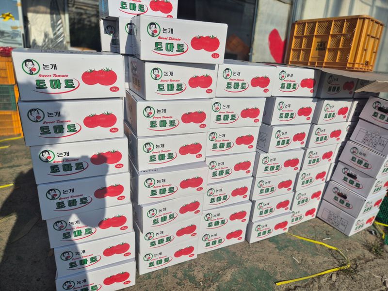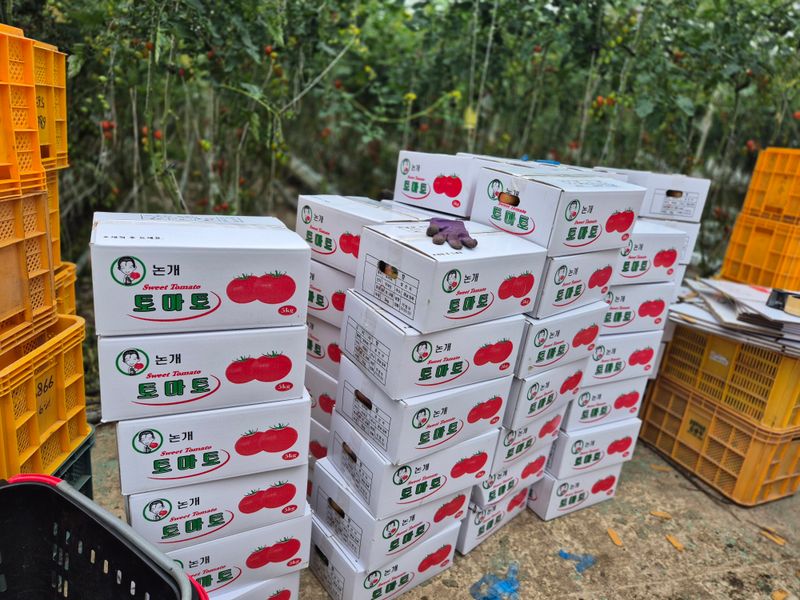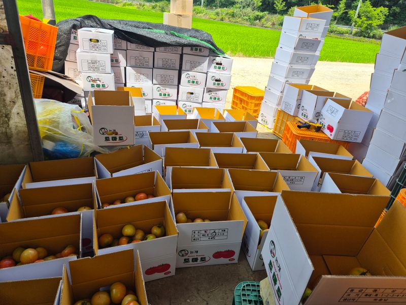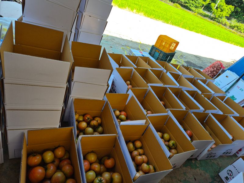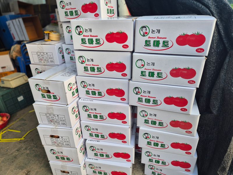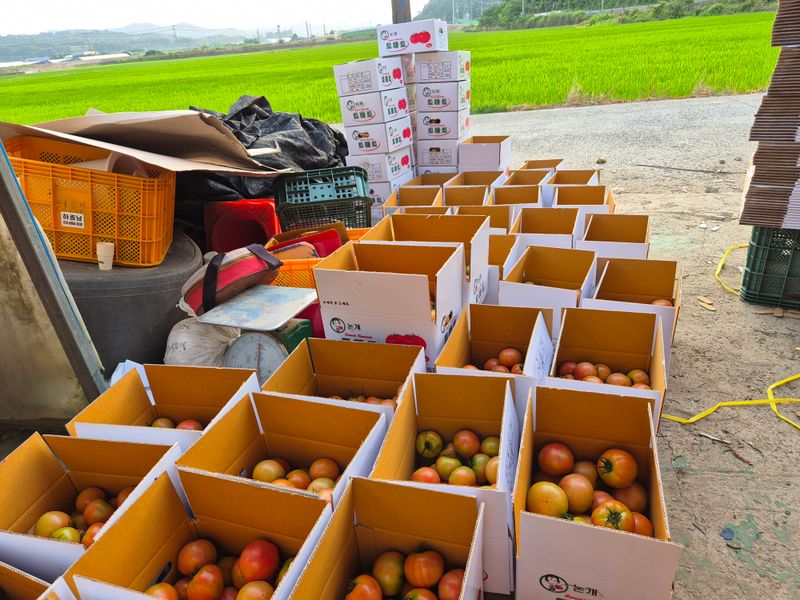 맑음 토마토 수확 선별 로컬(1명) 개천 카시미론 철거작업(5명)