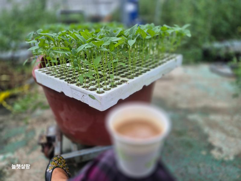 비 아침부터 비가 내려 인력들이 이반성 하우스로 되리고 왔다 토마토 나무 자르고 내렸다 손이 많다 보니 끝을 보았다 오후에는 코코베지 넣었다 피망 모종이 잘 자라기도 하지만 잦은 비로 잘록병이 보인다 프리엔 반병 섞어 저면관수 했다