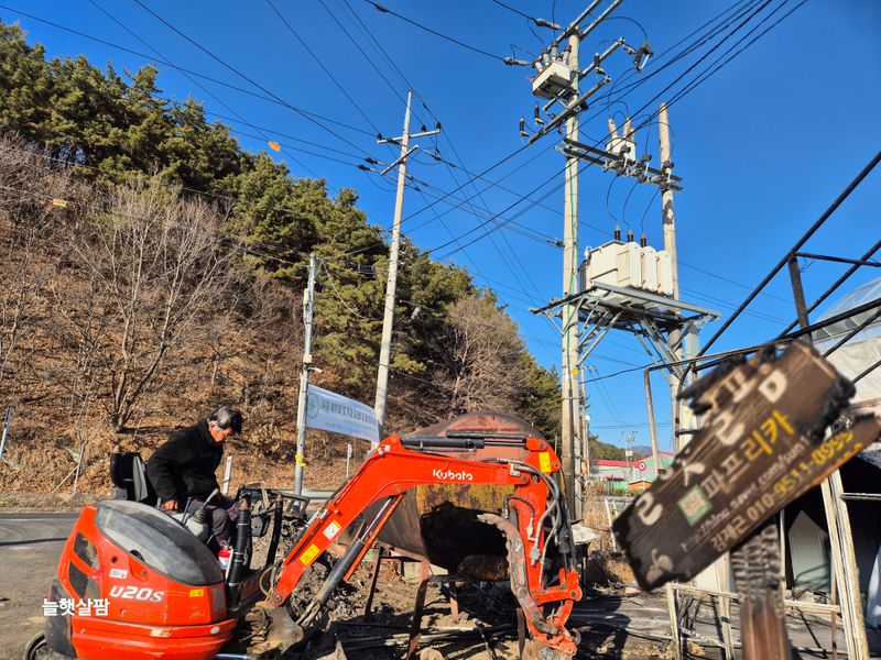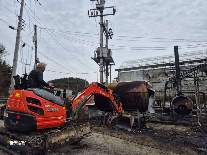 흐림 화재 현장 포크레인으로 수습중 보험회사 드론으로 현장 실사 위로차 방문자 대응 하기 밤새 애호박 냉해