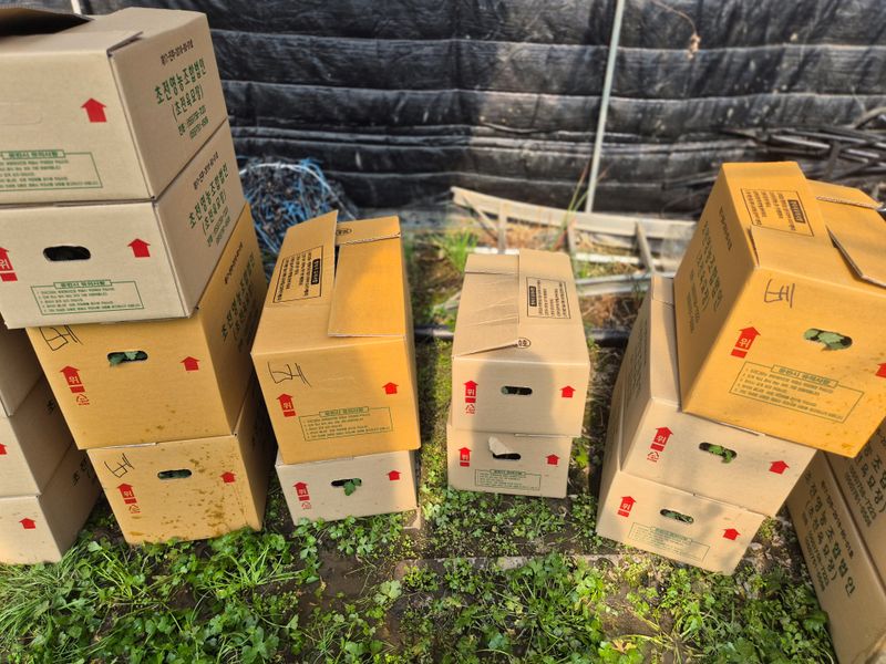 흐림 한두방울 비가 내리다 거쳤다 비가 가벼운지 오기 싫은 건지 모르겠다 애호박 수확이 시작 되었다 며칠전 주문한 애호박 박스 천개가 도착했다 애호박 매일 따 담으며 박스 채우기 해야 겠다