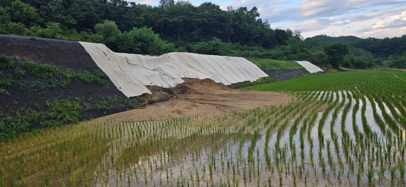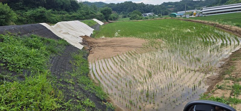 올해논학장공사(4개의논을2개로 만들어 는데요 논뚝이 무너졌습니다 장마에 더무너질가봐 걱정이 됩니다